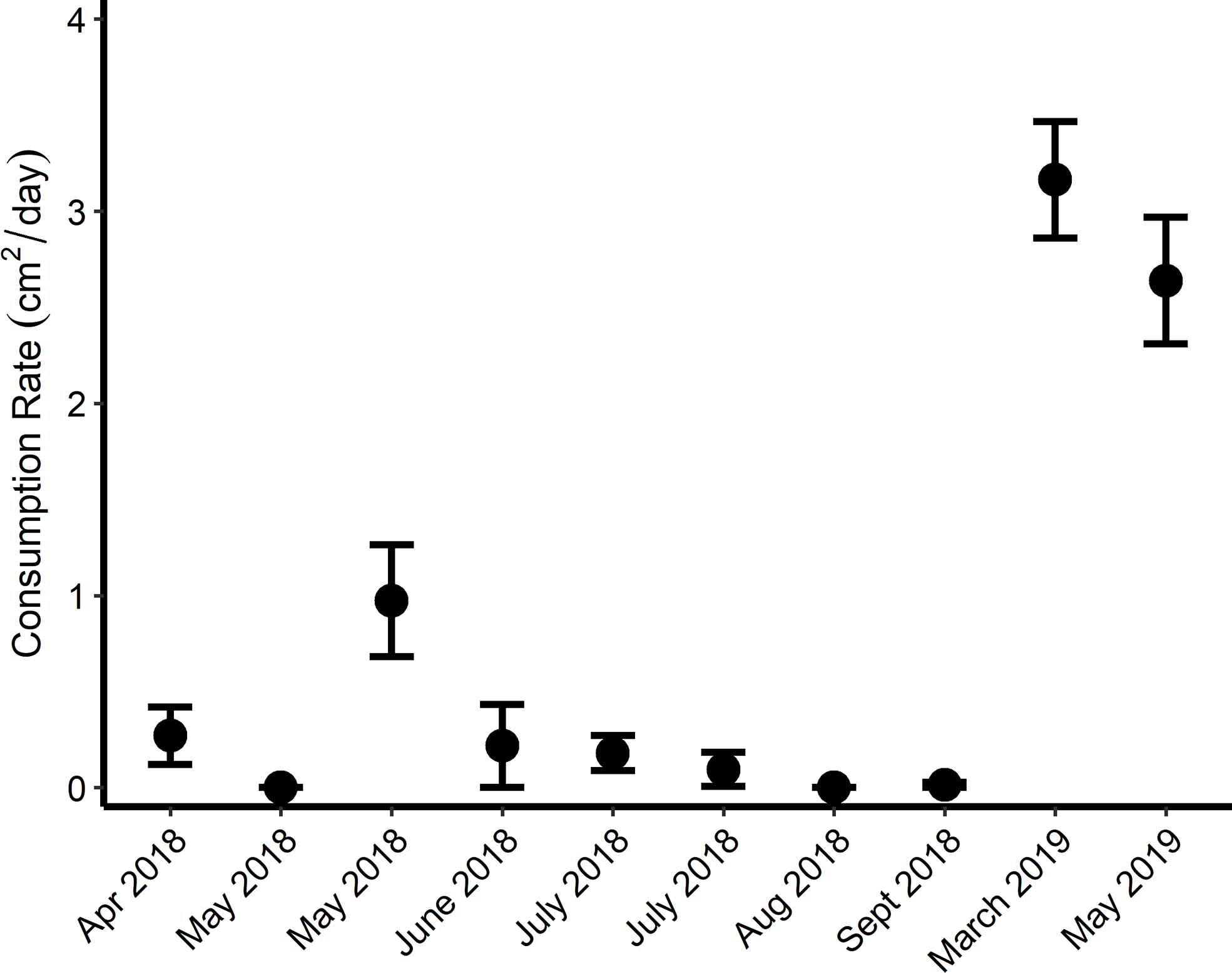 Consumption rates, cm2 day-1, (± 1 SE) of monthly turtlegrass (Thalassia testudinum) tethering experiments.