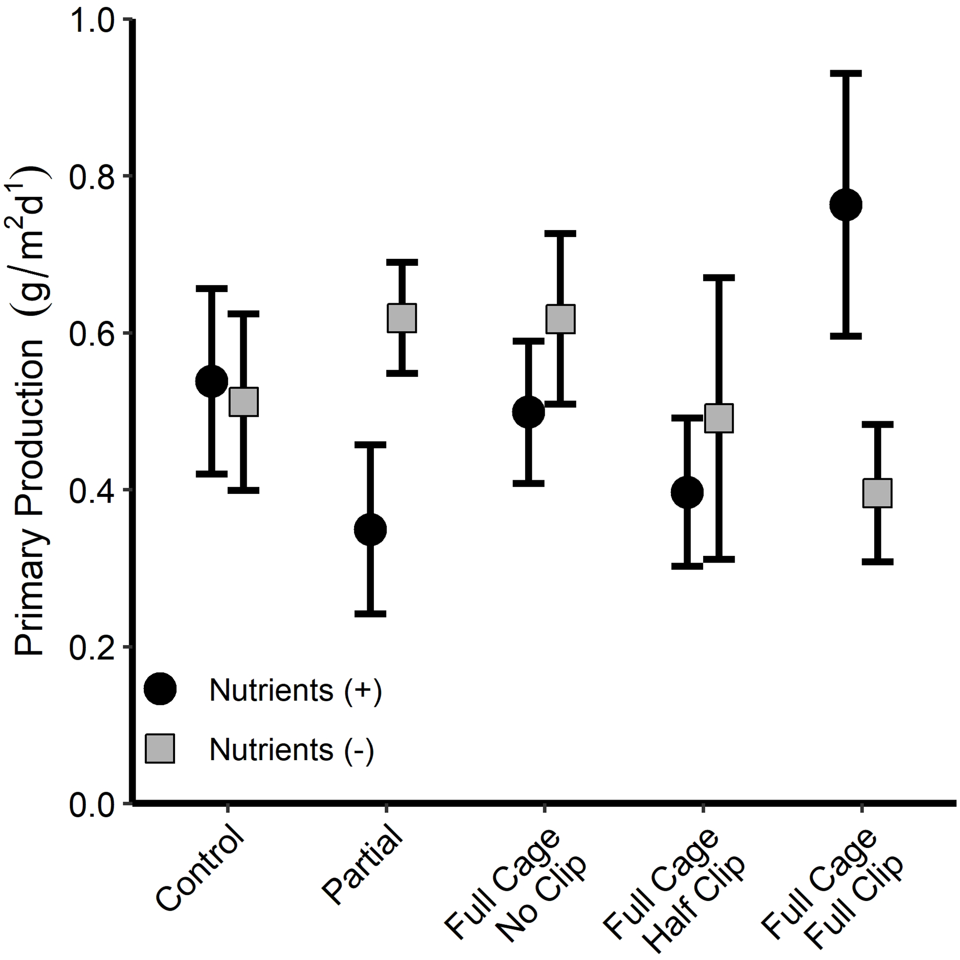 Mean Thalassia testudinum primary production values (± 1 SE) 4 months into the caging study. Full exclusion cage treatments also contained simulated grazing treatments. No clip = no clipping treatment. Half clip = top half of leaf clipping treatment. Full clip = fully clipped leaves (~1-2 cm above the sediment).