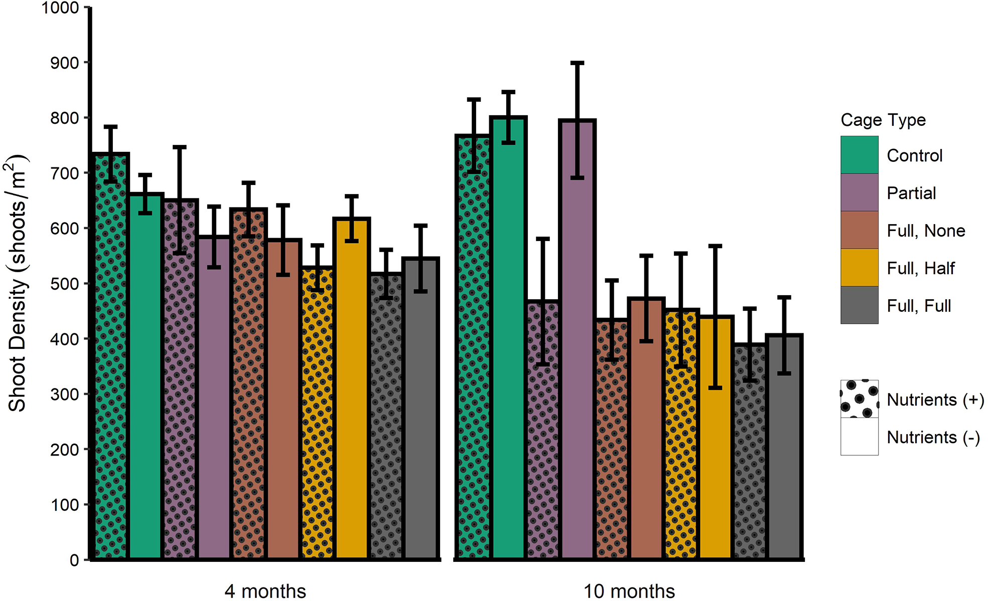 Thalassia testudinum shoot density means (± 1 SE) after 4 and 10 months of the caging experiment. Full exclusion cage treatments also contained simulated grazing treatments. Full, None = full cage, no clipping treatment. Full, Half = full cage, top half of leaf clipping treatment. Full, Full = full cage, fully clipped leaves (~1-2 cm above the sediment).
