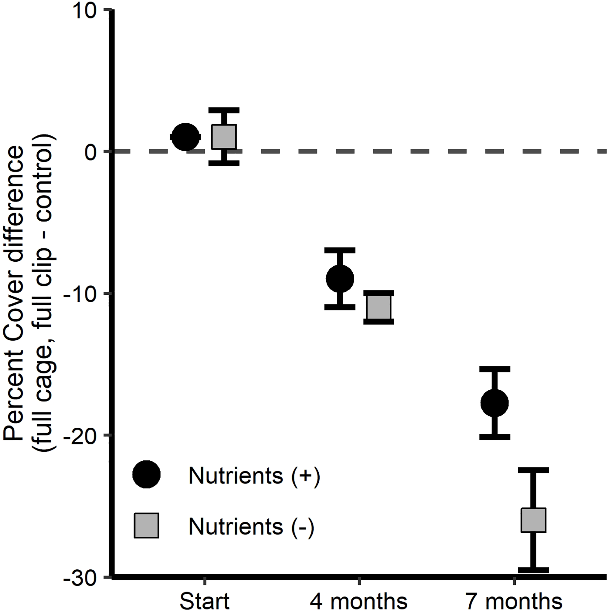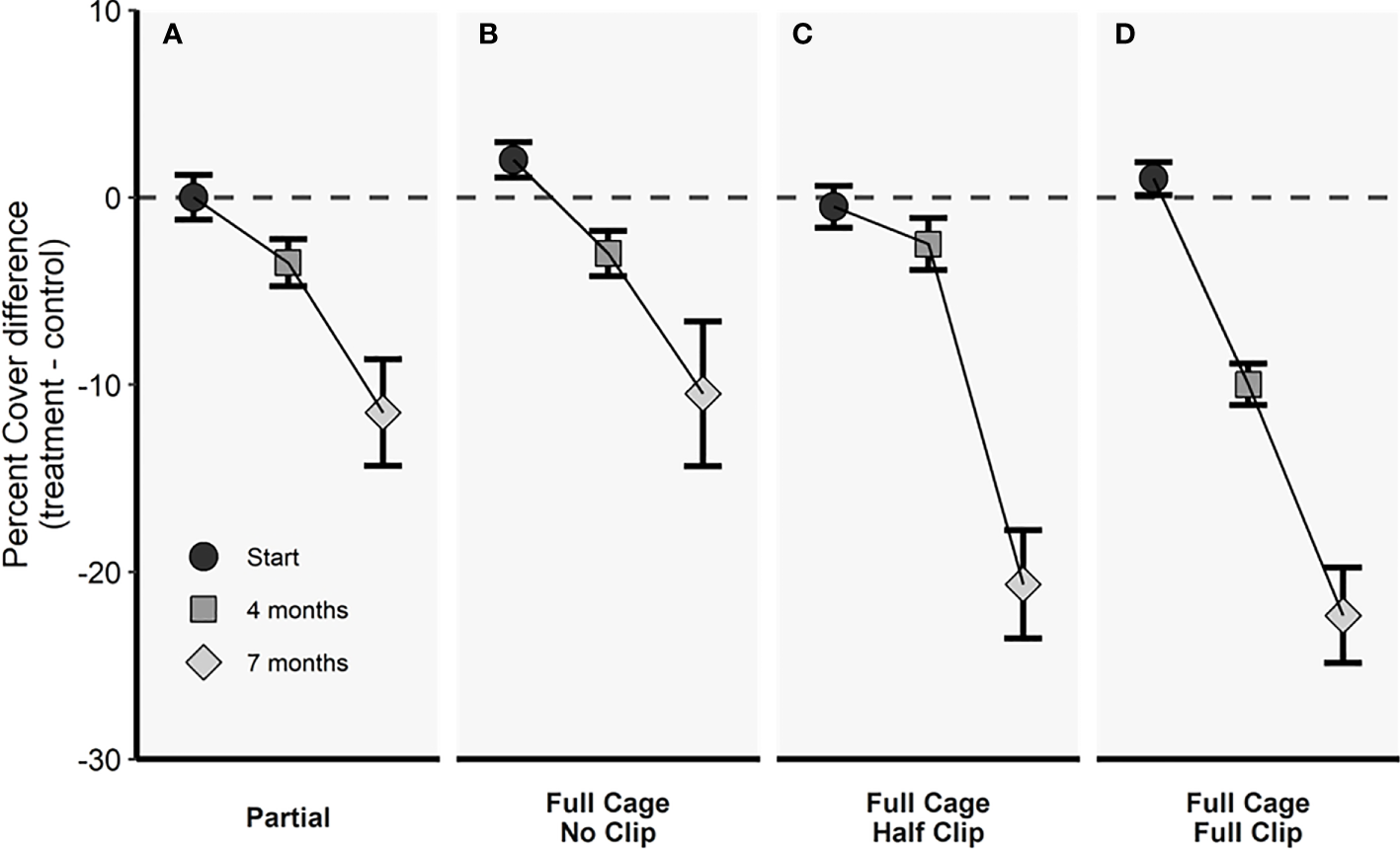 In the full cage treatment with full simulated grazing (Figures 8D, 9), there was a difference in treatment-control means between dates [F(2,34) = 59.631, p < 0.001], and nutrient-enriched treatments had a higher percent cover treatment-control means (i.e., nutrient addition mitigated some simulated herbivory effects [F(1,23) = 3.548, p = 0.072]), but there were no interactive effects between the factors [F(223) = 2.020, p = 0.155]. Post-hoc comparisons revealed after 4 months treatment values were less than control values when compared to the beginning of the experiment (p < 0.001), and 7 months of treatment effects resulted in lower percent cover for the full cage full clipping-control values than at the beginning of the experiment (p < 0.001) and 4 months into the experiment (p < 0.001).