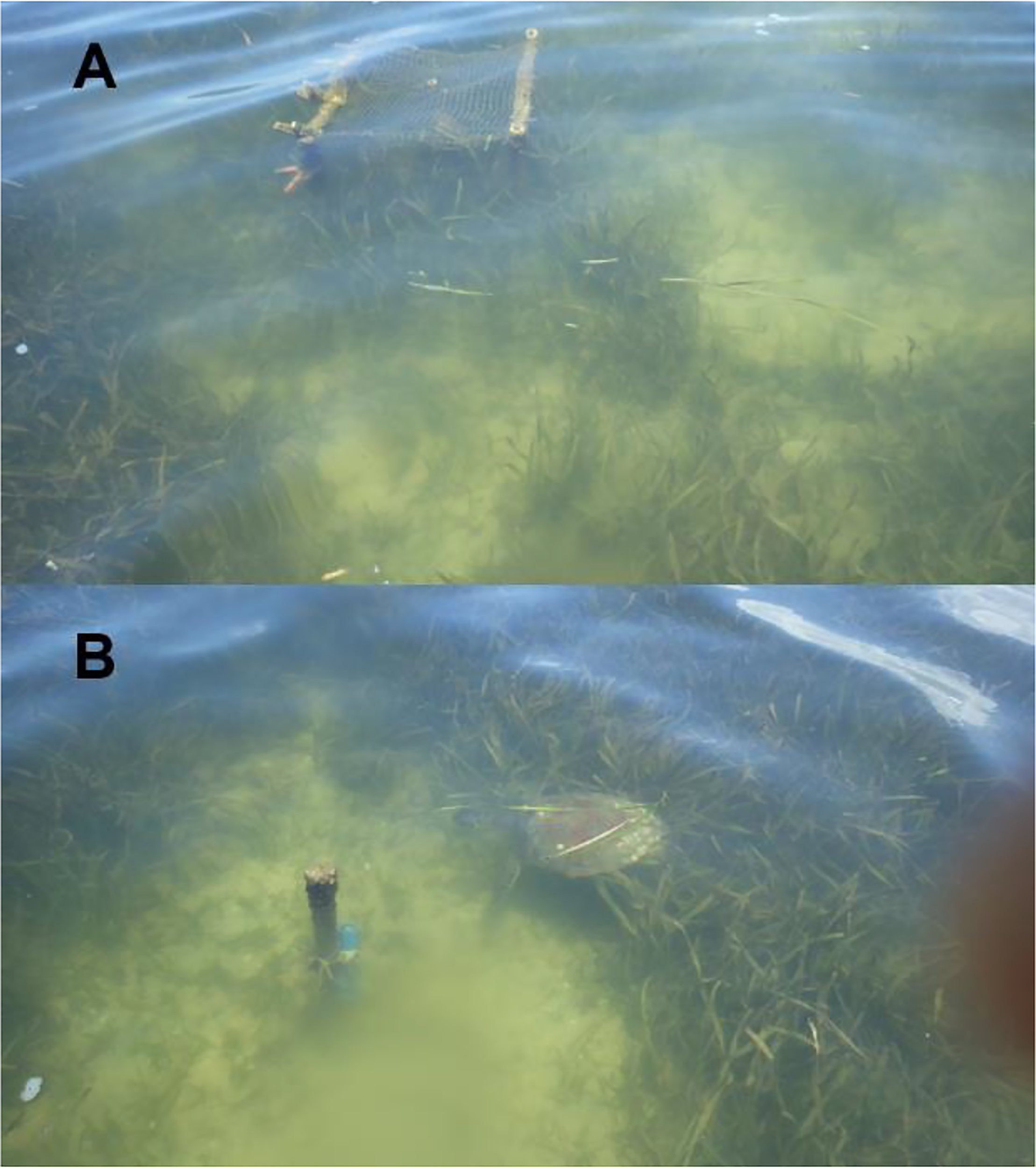 (A) green turtle (Chelonia mydas) grazed area adjacent to one of the cages; and (B) a juvenile green turtle entering a grazed patch near a temperature sensor just outside our experimental cage array.