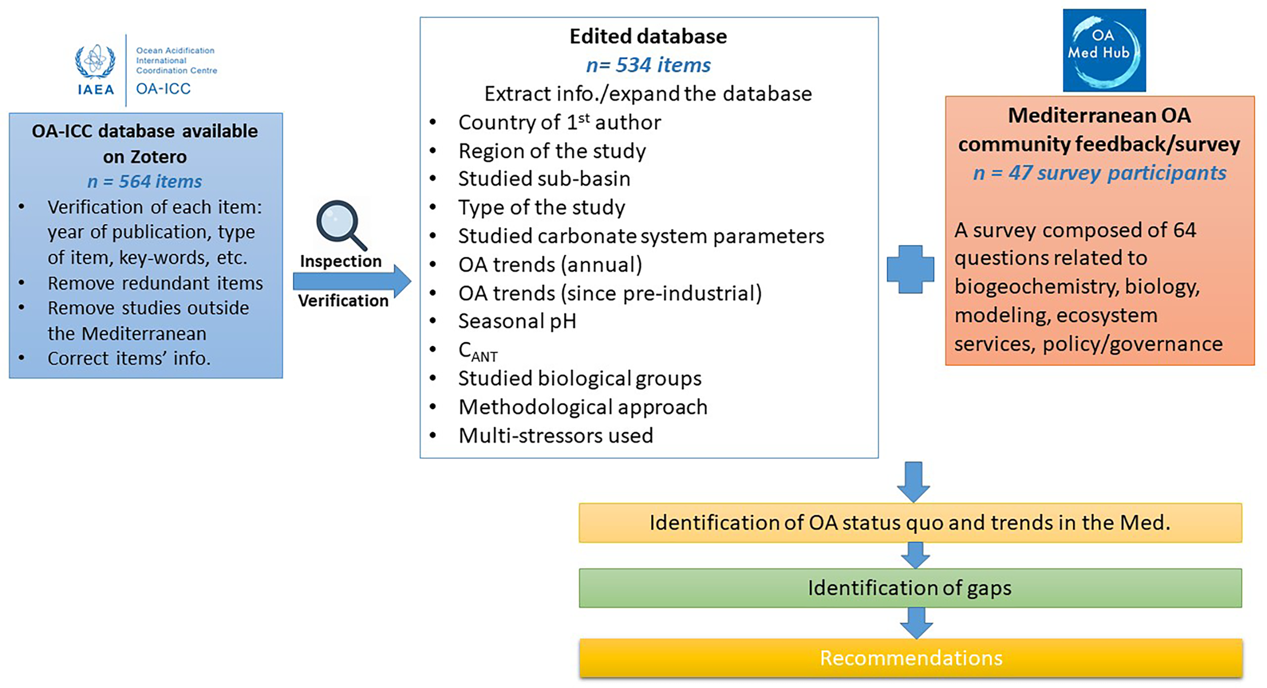 Using the OA-ICC database (Bibliographic databases|Ocean Acidification (news-ocean acidification-icc.org)/ https://www.iaea.org/services/oa-icc) via Zotero (Zotero | Groups > OA-ICC), 534 articles (Tables S1, S2), compiled by December 2021, on ocean acidification in the Mediterranean Sea were collected (out of a total of 8955 articles worldwide). The OA-ICC database keywords were used to filter the geographic location, date and type of the publication, studied organisms, process and parameters, and the applied methodology (see Microsoft Word - UserInstructions for the OA-ICC Bibliographic Database 2021 final.docx (news-oceanacidification-icc.org)).