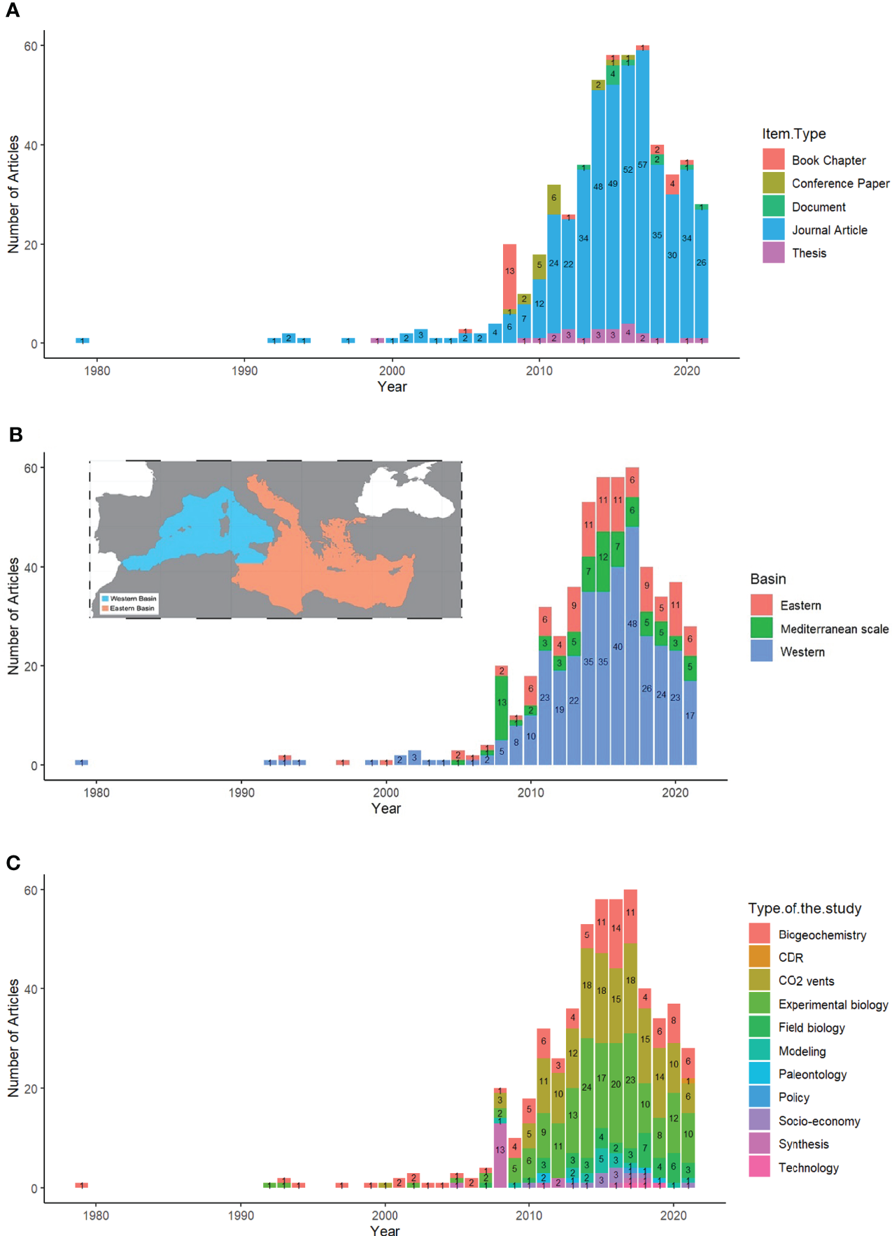 The evolution of OA-related publications through years in the Mediterranean: (A) showing the various types of OA-related items, (B) studies conducted in the main units of the Mediterranean basin, (C) the different types of OA studies.