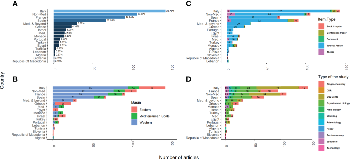 Productivity of OA-related studies: (A) per country* and groups, (B) per type of the OA-related items, (C) per the geographic location of the study, (D) per type of the tackled OA-related topic. Articles published by multiple Mediterranean countries are referred to as “Med.”, by Mediterranean and non-Mediterranean countries as “Med. & Beyond”, and by non-Mediterranean countries as “Non-Med.”. *Per country corresponds to the number of OA items published by the 1st/corresponding author(s) affiliated to institutions in a specific country or countries.
