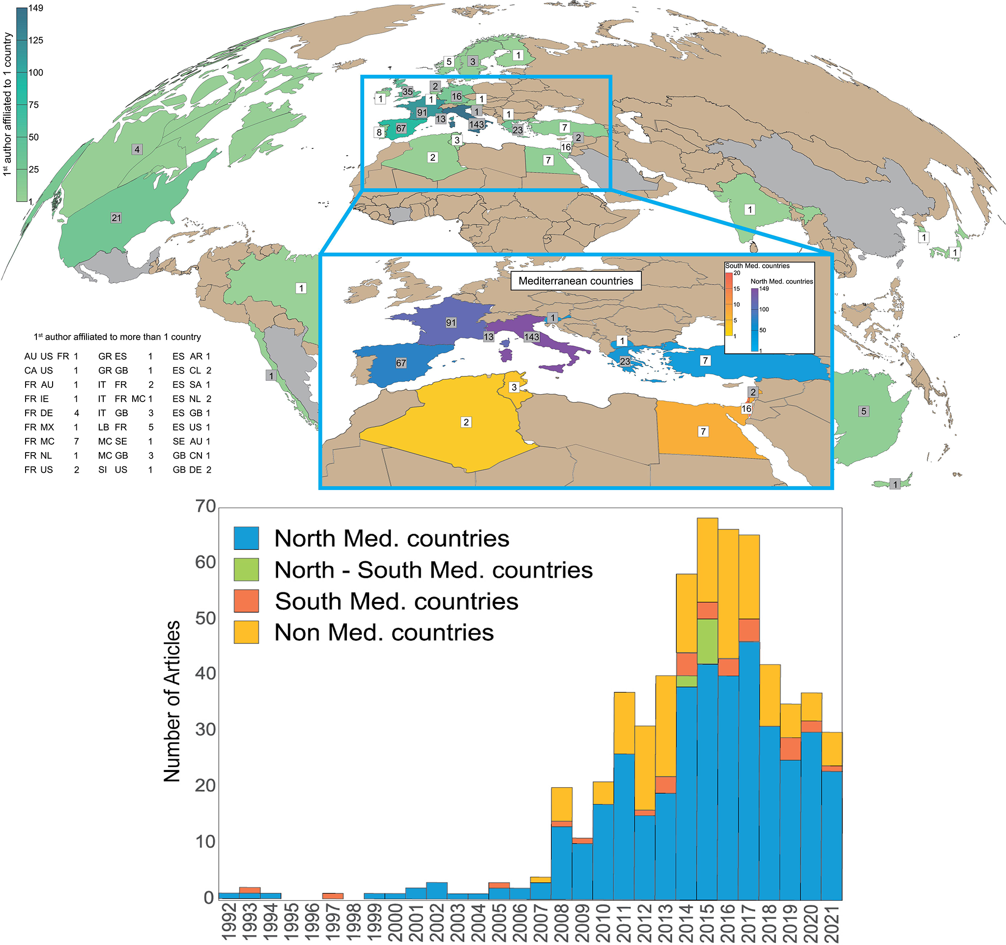 Top) Number of OA-related items per country of the 1st/Corresponding author(s). Gray-background numbers are referring to countries having a 1st/Corresponding author affiliated to more than one country. In the latter case, countries’ abbreviations are shown in details on the bottom left panel according to the UN/LOCODE Code List for every country and territory (UN/LOCODE Code List by Country and TerritoryUNECE). Bottom) The OA-related productivity in function of years for the North, South, North-South Mediterranean, and the non-Mediterranean regions.