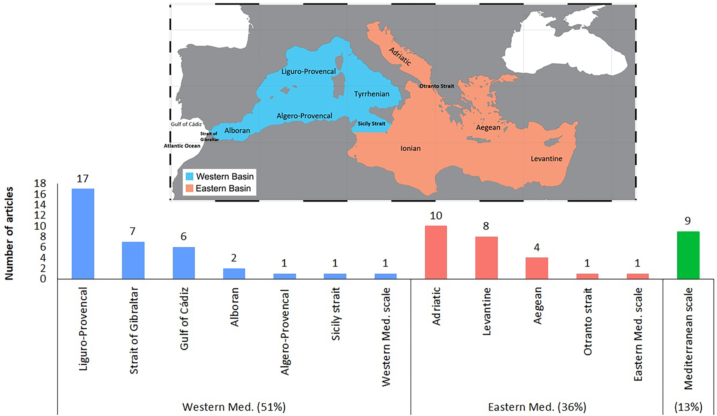 The bibliometric assessment clearly shows that a considerable effort has been made over the last decade to characterize the carbonate system in order to estimate the concentration of anthropogenic CO2 that has already been absorbed, and to evaluate the corresponding pH trend in the Mediterranean. Most of the studies (51%) were conducted in the Western Mediterranean basin, followed by 36% in the Eastern basin, and 13% at trans-Mediterranean level. The Liguro-Provencal sub-basin is the most studied compartment of the Western basin, while the Adriatic sub-basin is the most studied in the Eastern basin (Figure 5). Articles dealing with water exchanges between the Mediterranean Sea and the adjacent oceanic compartments (Atlantic Ocean, Marmara Sea and Red Sea), as well as between the Mediterranean sub-basins, correspond to 15% of the working dataset, with a special focus on the Strait of Gibraltar (12%).
