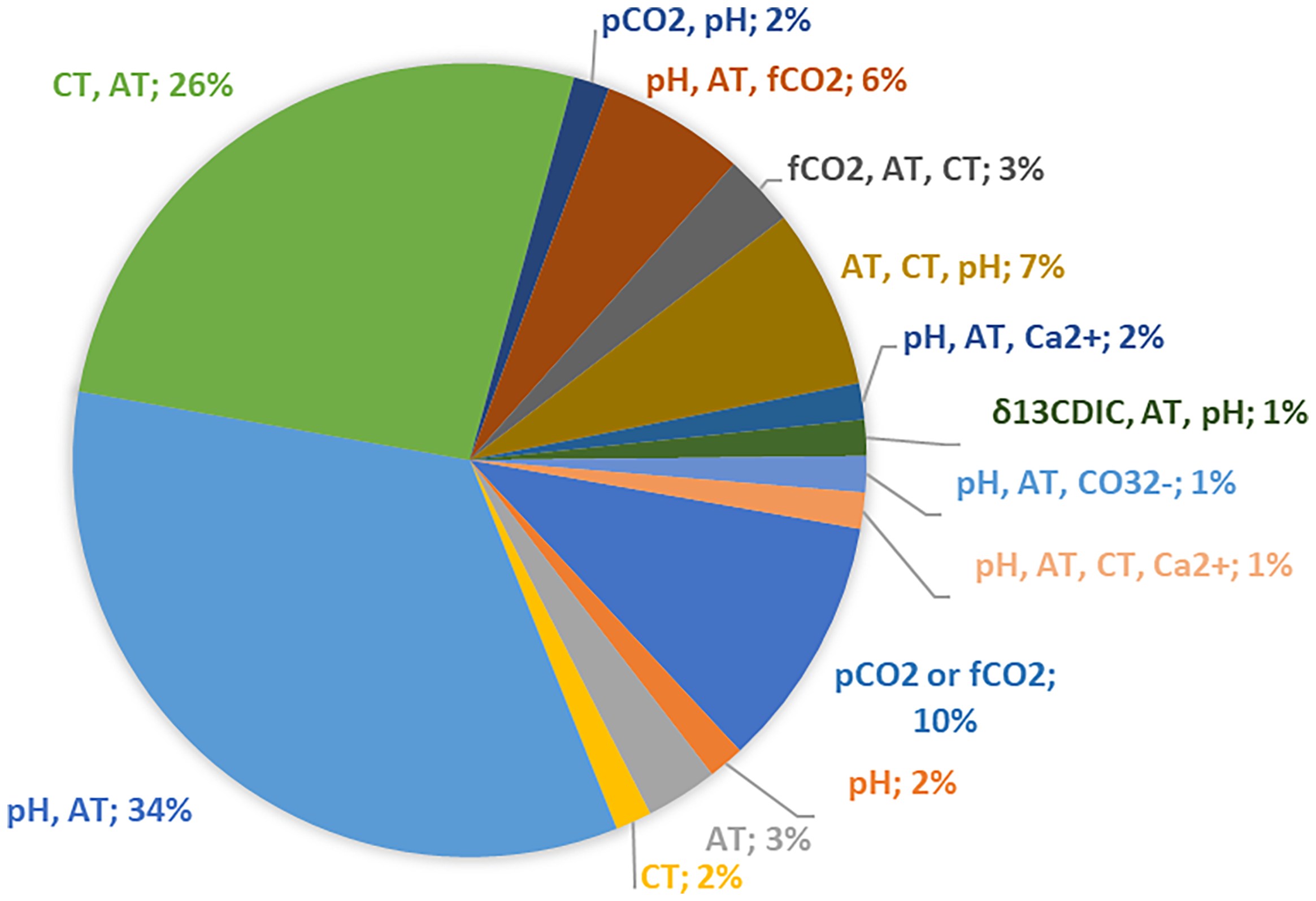 To constrain the carbonate chemistry in seawater, two out of four carbonate system parameters should be measured: total alkalinity (AT), pH, partial pressure of CO2 (pCO2) and/or total dissolved inorganic carbon (CT) (Touratier and Goyet, 2011; Hassoun et al., 2015; Krasakopoulou et al., 2017). The vast majority of research dealing with OA chemistry includes two different combinations of the seawater carbonate system measurable parameters (pH and AT: 34%, CT and AT: 26%).