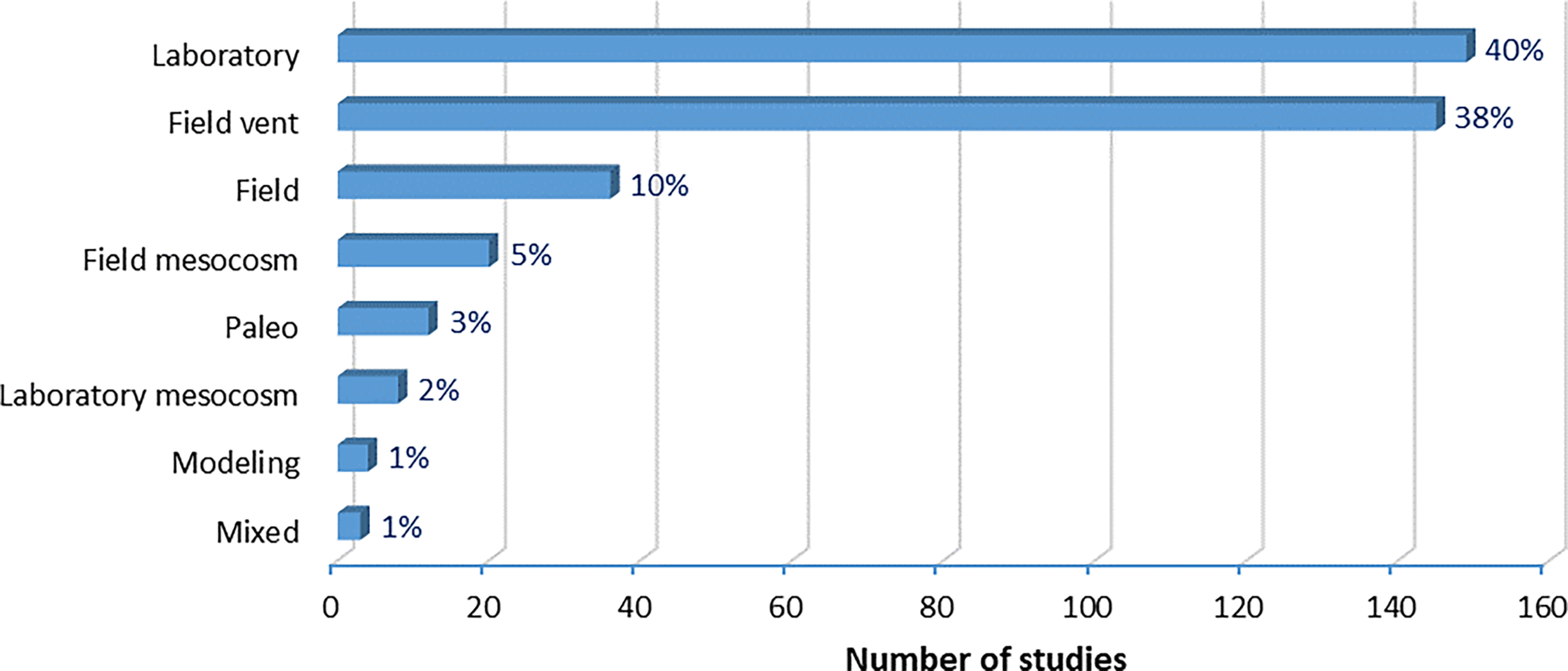 A major advantage of using pH gradients in CO₂ vent sites is the possibility of studying effects at a community level, under natural light, nutrients’ concentrations, and current conditions, which explains why 38% of OA biological studies adopted the field vent approach (Figure 8). In many laboratory studies (>40% of biological study approaches, Figure 8), stable pH conditions are used to infer effects of OA, which might have limited comparability to realistic conditions in natural environments. Due to the complexity of studying whole communities, only ~11% of the studies (42 in total) have tackled the community-level (Figure 7), with more than half (57%) of community studies implemented in field settings and the majority (45% of community level studies) in field vents. Laboratory settings were used in 14% of the studies, while 26% of the studies used a review of existing literature to unravel the effects of OA on communities.