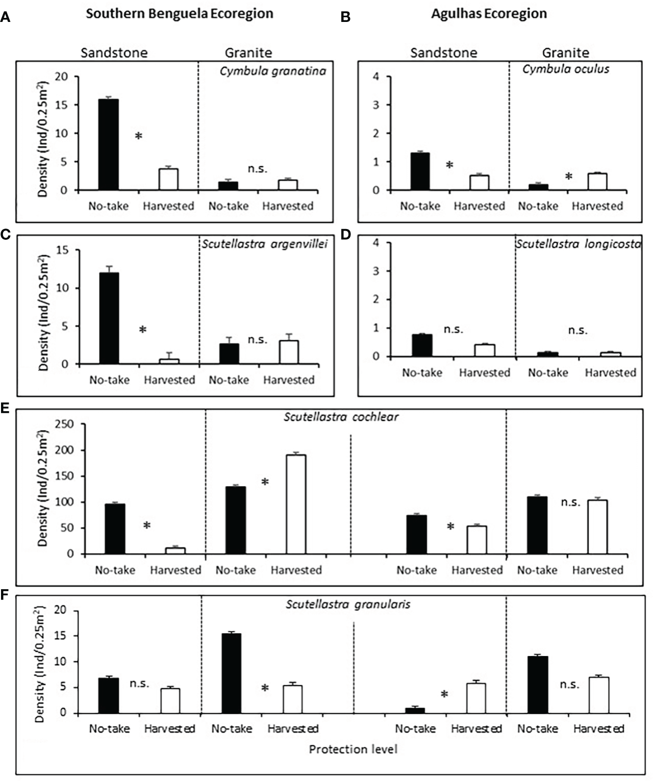 Mean densities (+1SE) of the frequently harvested limpets (A)Cymbula granatina, (B)C oculus and (C)Scutellastra argenvillei, and the rarely harvested limpets (D)S. longicosta, (E)S. cochlear and (F)S. granularis, with regard to protection level and rock type. The first four species (A-D) occur predominantly in only one ecoregion, so this factor was not included for their analyses, but was included in the analyses for the fifth and sixth species), which occur in both ecoregions. Ind, individuals. Asterisks between bars, Bonferroni-corrected significant differences; n.s., non significant.
