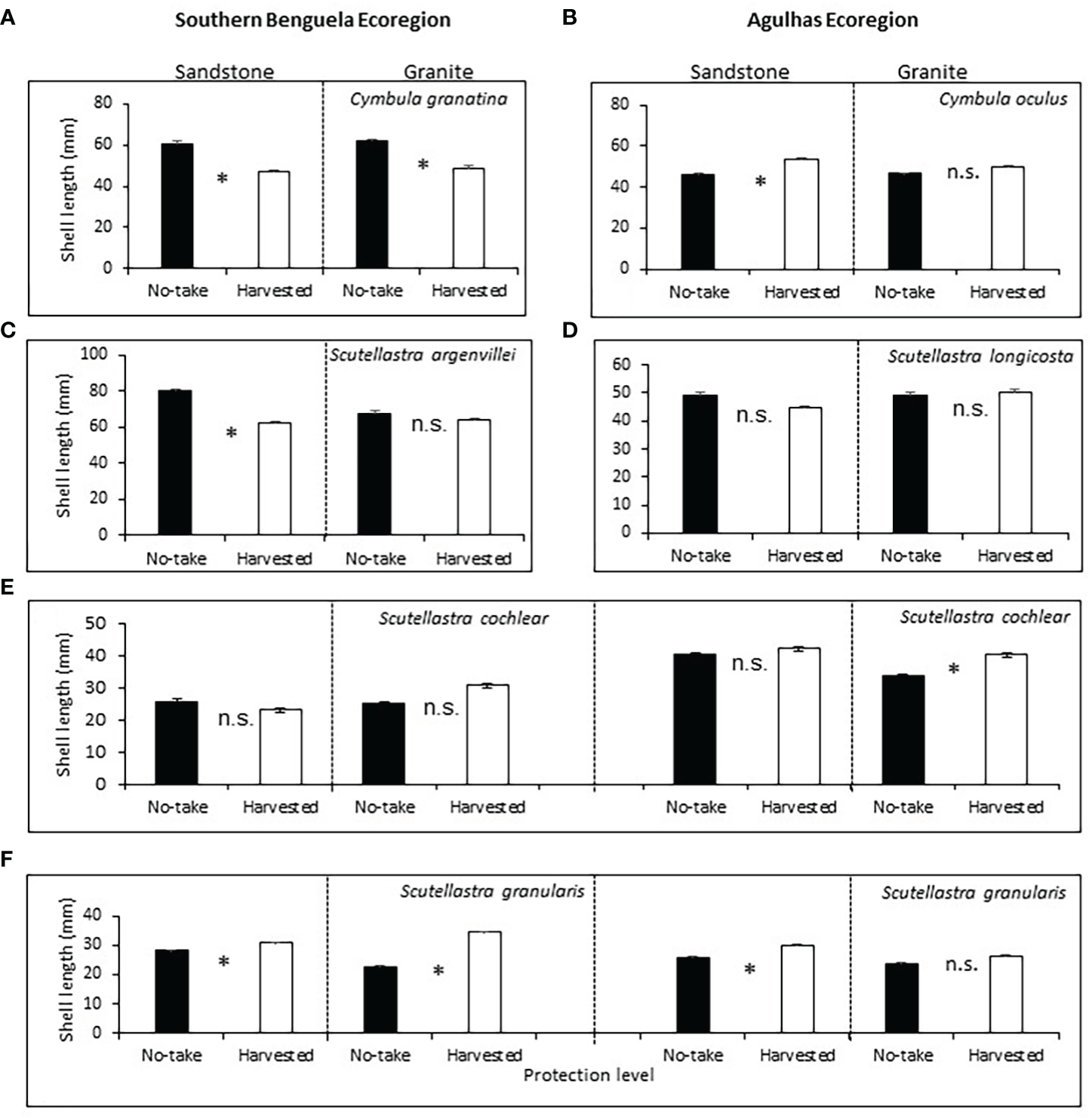 Of the rarely or never harvested limpets (Supplementary Table A4), the size of S. longicosta, was not affected by either protection level or rock type (Figure 4D). For S. cochlear, sizes were greater in harvested than no-take areas in the Agulhas ecoregion on granite, but protection had no effect elsewhere (Figure 4E). For S. granularis, sizes were significantly larger in harvested areas in the Benguela on both TMS and granite and on Agulhas TMS, but not significantly different on Agulhas sandstone (Figure 4F).