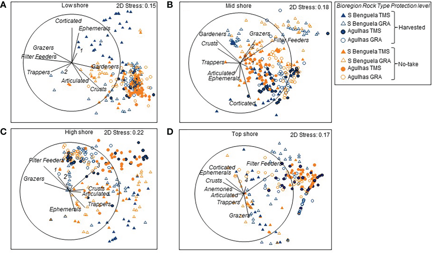MDS plots showing differences in community composition among quadrats reflecting the effects of Protection, Ecoregion and Rock type for (A) low, (B) mid, (C) high and (D) top zones of 16 sites within the Table Mountain national `park MPA, which spans the Southern Benguela (S Benguela) and Agulhas ecoregions and features Table Mountain sandstone (TMS) and granite (GRA) For clarity some functional groups are numbered: 1 – Predators ad scavengers; 2 = anemones; 3 = Corticated alage; 4 – Gardeners.