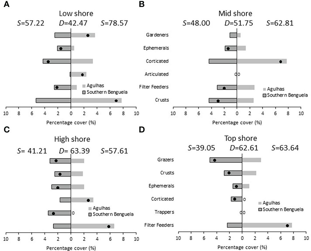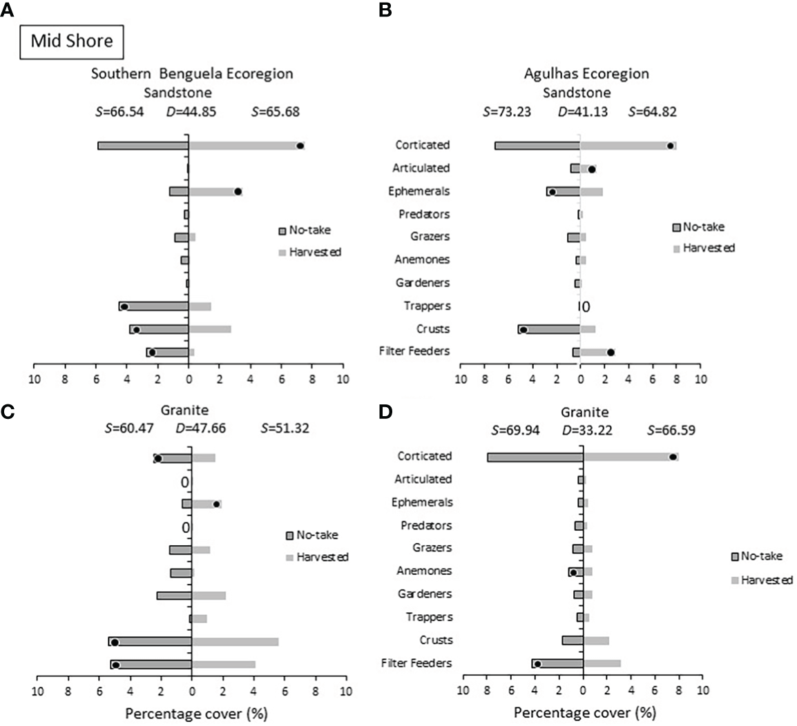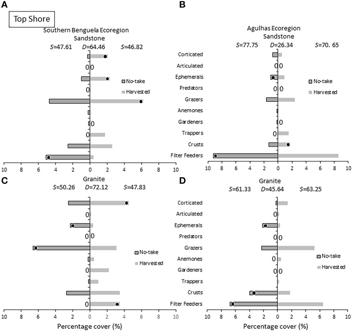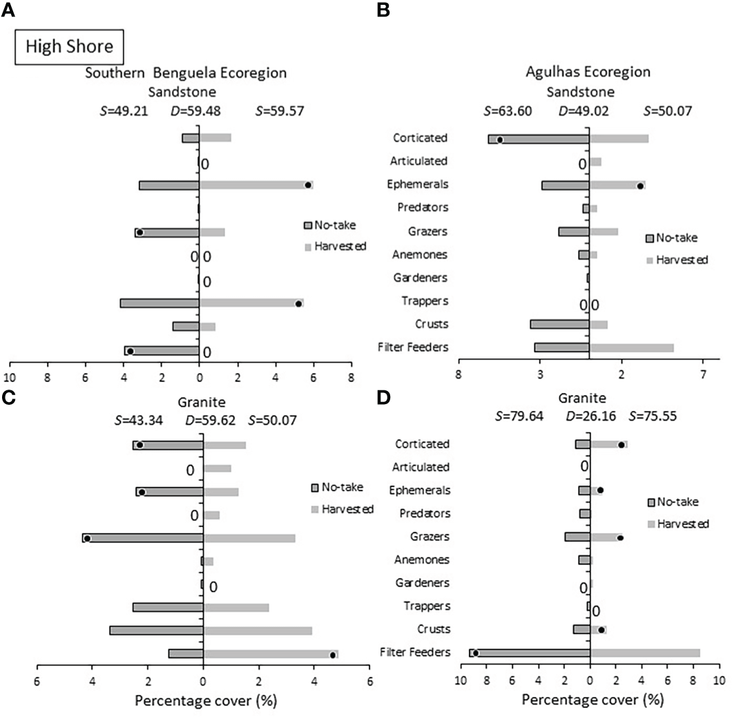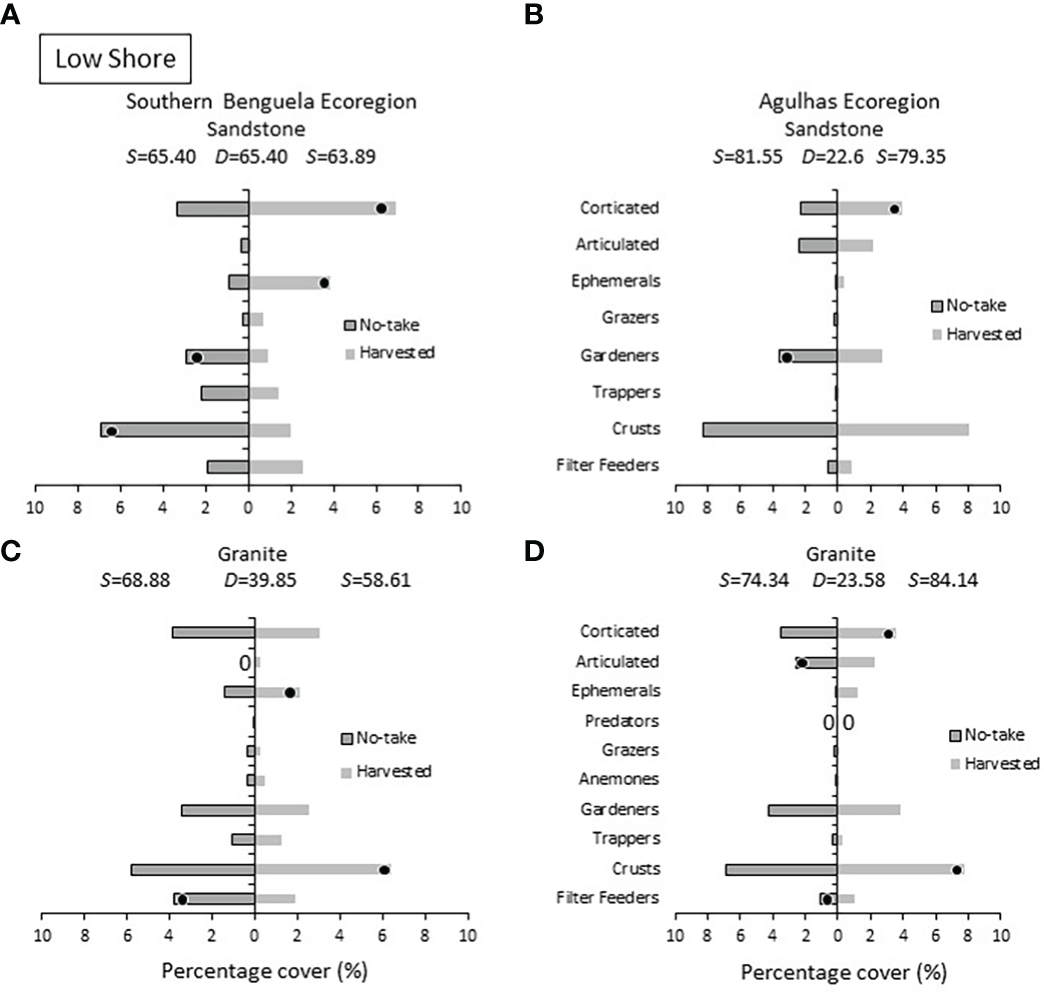 Low shore: Percentage cover of groups responsible for the similarities (S) within harvested or no-take areas and the dissimilarities (D) between them, on sandstone in (A) the Southern Benguela and (B) in the Agulhas Ecoregion, and on granite in (C) the southern Benguela and (D) Agulhas. Black dots identify groups distinguishing between harvesting and no-take zones and are placed in the zone with the greatest abundance; 0 = absence.