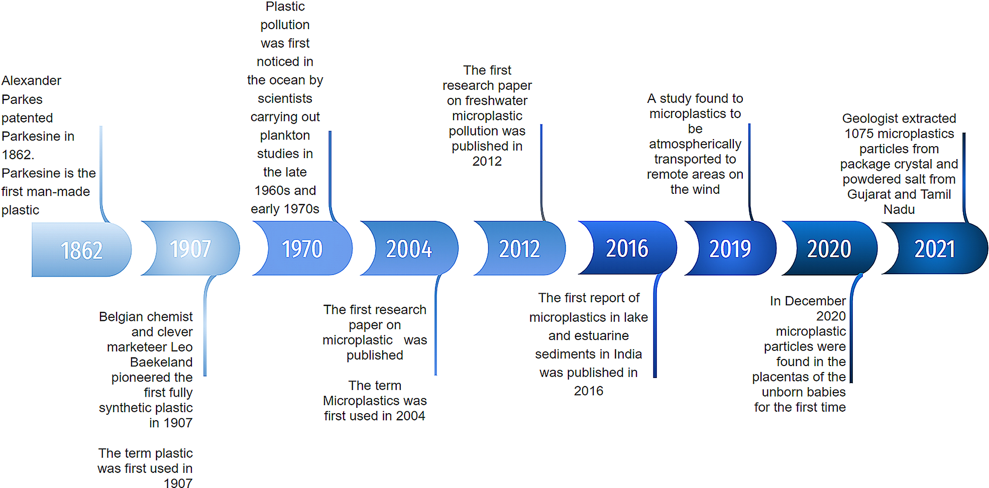 Flowsheet shows the milestones in evolution of plastic to microplastic over the years.