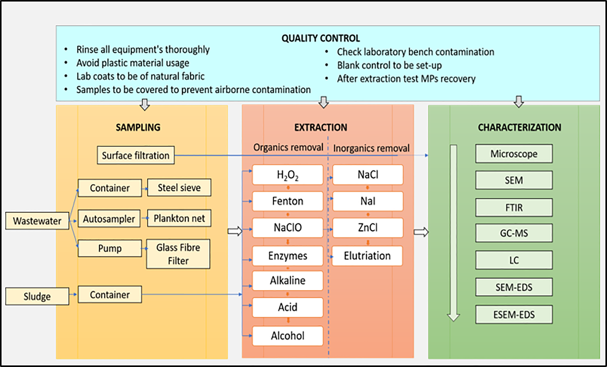 Diagram encapsuling the various steps and techniques used in WWTPs for microplastics detection (Modified from (Sun et al., 2018).