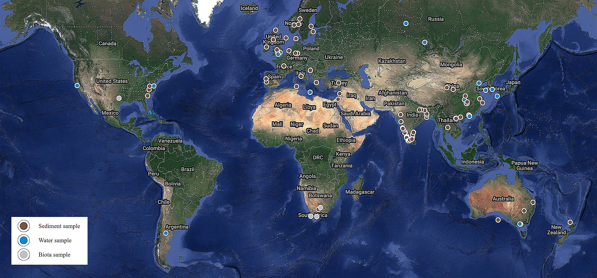 Map presenting the microplastic sampling in various areas outlined across the globe.