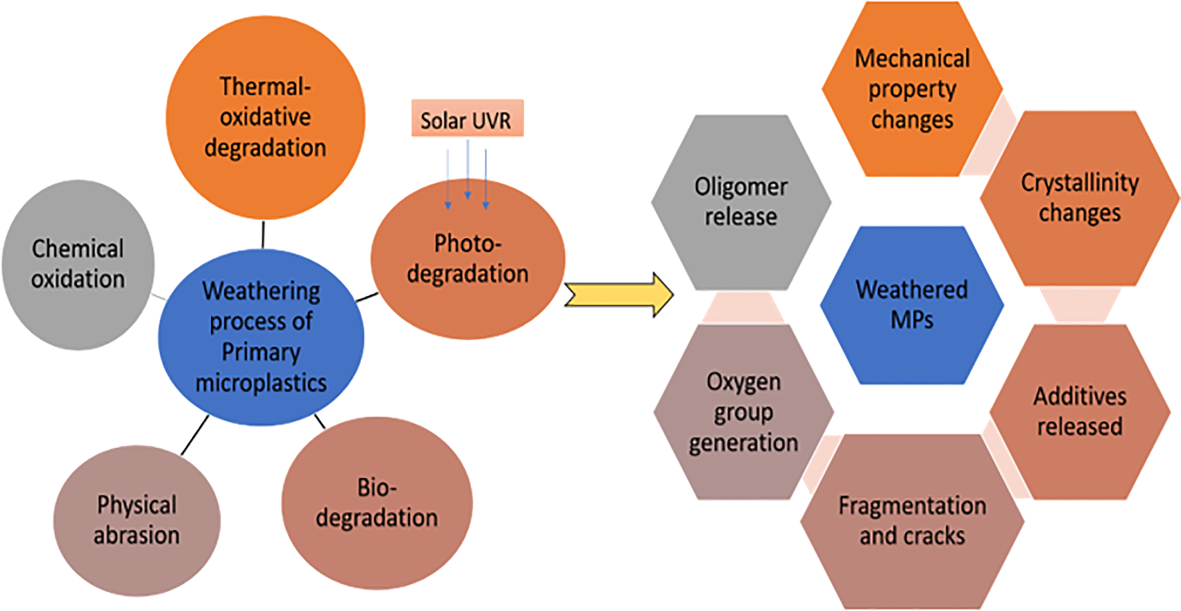 Plastics, including MPs depending on the polymer’s physical and chemical characteristics and the environmental conditions, undergo biotic and abiotic processes of degradation (Sascha et al., 2018; Ali et al., 2020; Oliveira et al., 2020). Under favorable conditions, the general degradation processes of MPs include weathering triggered mechanical disintegration, photo- or thermal degradation linked to oxidation, and microbial and enzymatic degradation. Nevertheless, these become insignificant in the aquatic environment and additionally the complete breakdown or final state of reduced plastic particles is still not accurately understood; instead, they are assumed to be a constant (Ali et al., 2020).