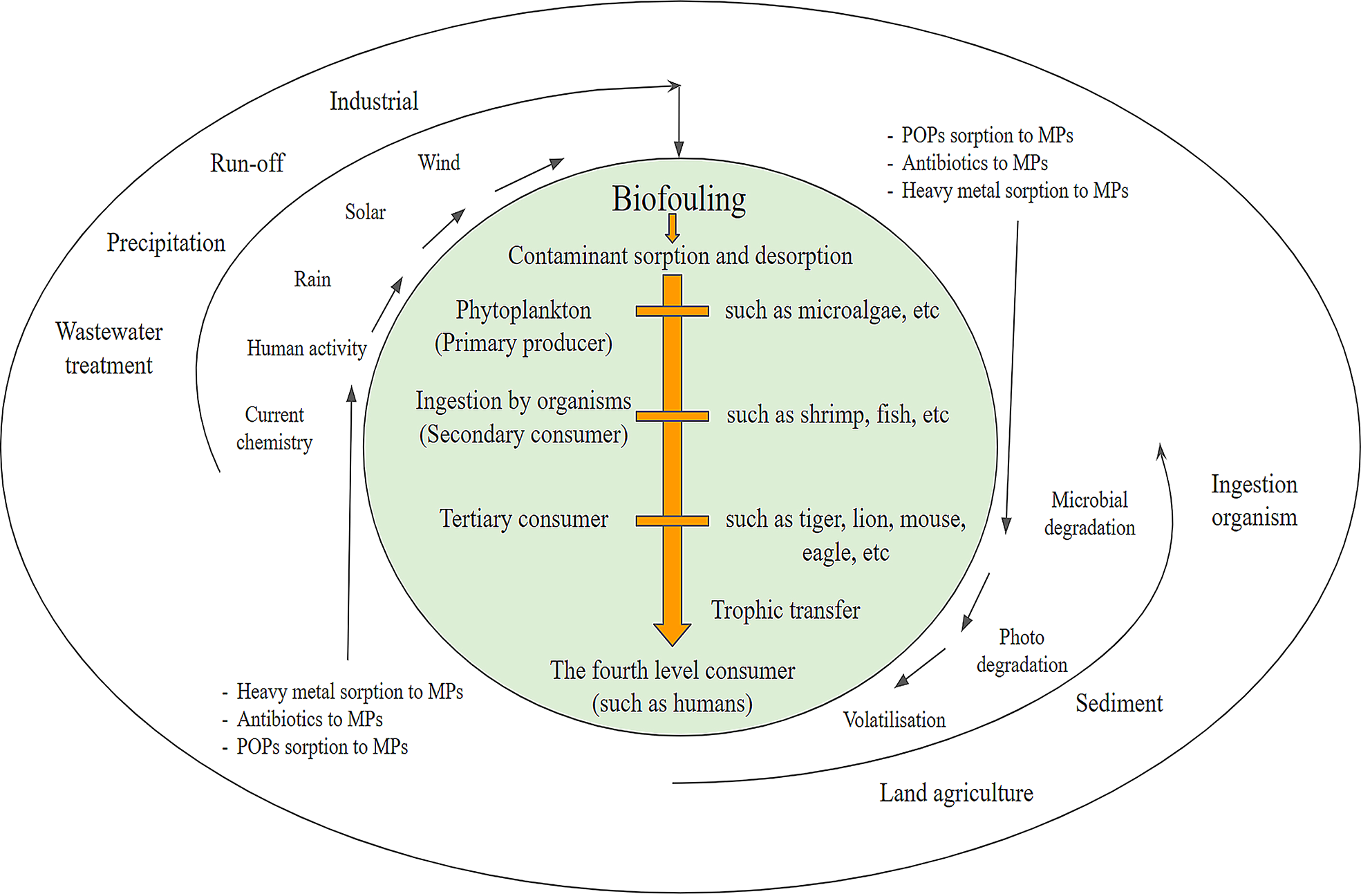 Further, many chemicals and additives are added to plastics for altering their mechanical properties with approximately 4,000 chemicals in plastics used for food packaging alone. As consumption of plastic increases, accordingly concentrations of the debris and waste have increased as well, after the plastics have been used and discarded. MPs have been found and reported as early as the 1970s, and today it has become a major contributor to the plastic debris generated. MPs are being ingested by numerous smaller organisms like planktons and higher organisms such as fishes and thus entering the MP into the food chain (Andrady, 2011; Smith et al., 2018). Dumping of plastic litter off marine vessels remains the chief source of plastic debris in the marine environment. Despite regulations, dumping of plastic litter contributed as much as 6.5 million tons of plastic to the oceans in the early 1990s (Cole et al., 2011). Other sources include discarded fishing gears, microbeads from cosmetic and healthcare products running off via domestic or industrial drainage, and aquaculture. A large proportion of the plastics are present in the form of secondary MPs generated by abrasion and fragmentation of more significant plastic fragments. Cole et al. assessed that there were additionally 5 trillion plastic pieces of debris afloat on the sea, 90% of which were secondary MPs derived from fragmentation (Cole et al., 2011).