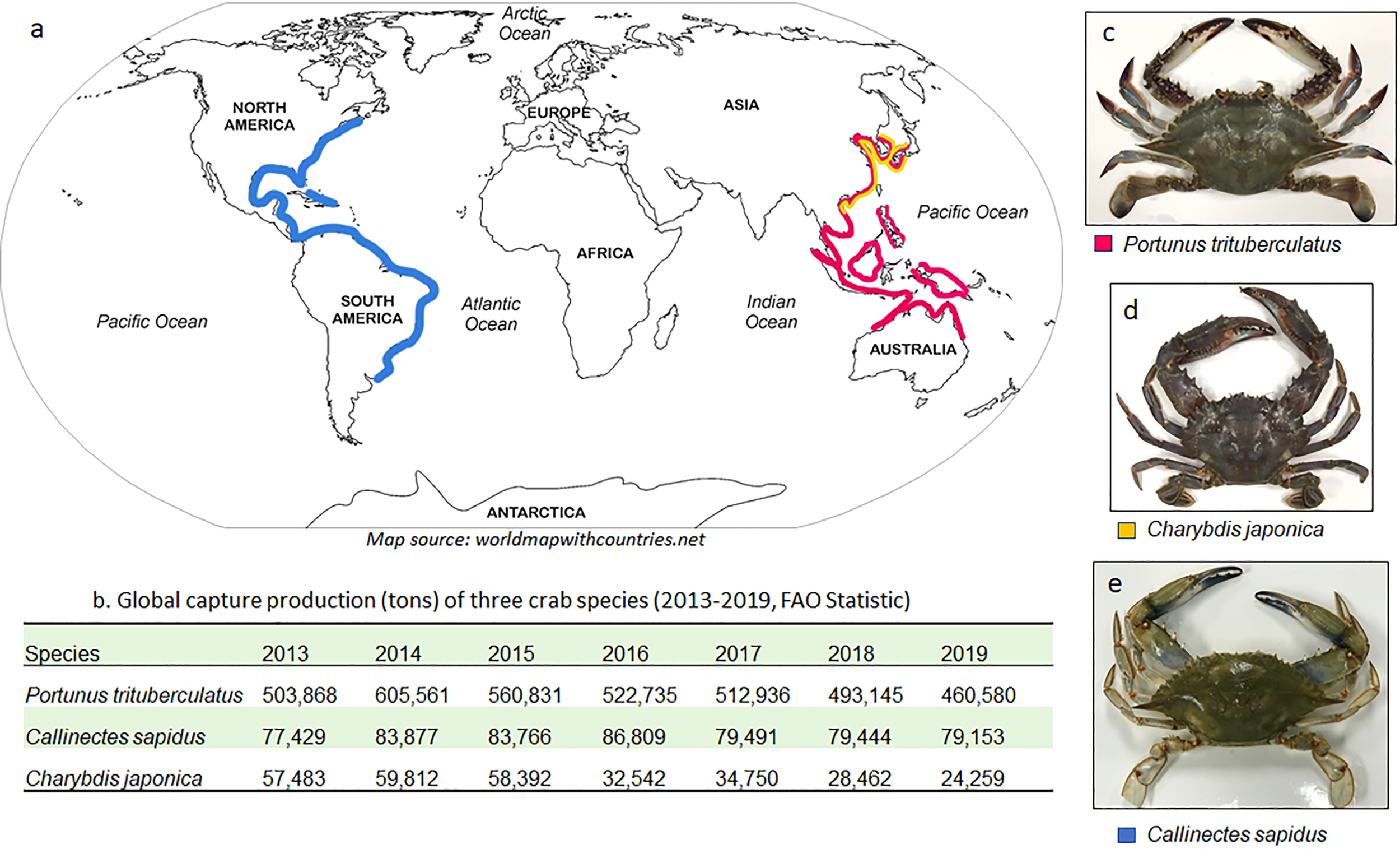 The distribution (A), global capture production (B) and photographs (C–E) of three swimming crabs.