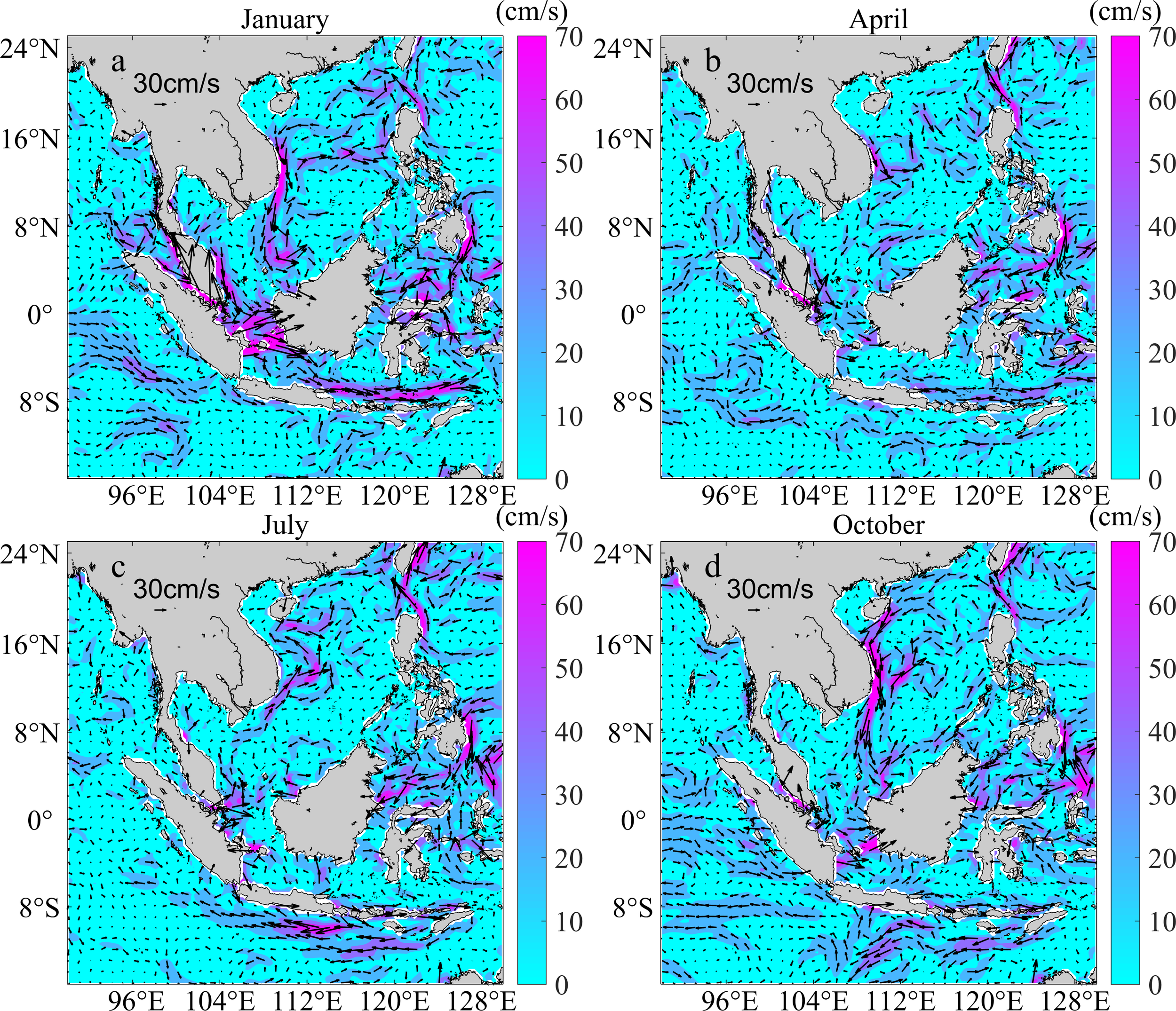 Ocean currents in January, April, July, and October, 2019 in the Indo-Pacific convergence region. Arrows show the circulation direction, and the arrow length and color scale bar indicate the flow rate.
