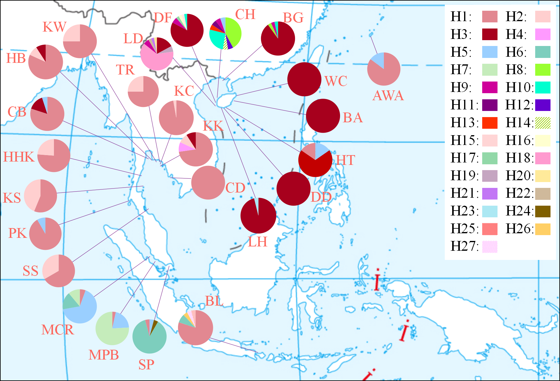 Geographic distribution and relative frequency of 27 mitochondrial cox1 haplotypes in 25 populations.