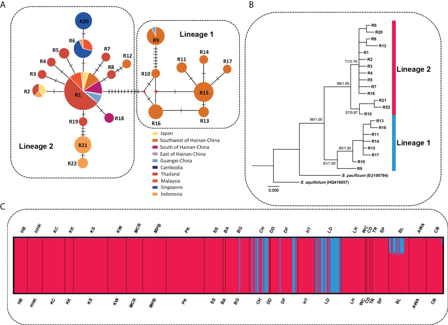 Parsimony median-joining network, phylogenetic relationships among ribotypes, and STRUCTURE analysis of S. polycystum inferred from nuclear ITS2. (A) Median-joining network of nuclear ITS2 ribotypes. Circle size is proportional to the population sample size. Each crossbar between ribotypes represents one mutation step, and different colors indicate different regions. Small red triangles indicate extinct or unsampledribotypes. (B) Maximum likelihood (ML) tree of S. polycystum based on nuclear ITS2 ribotypes. Node values are bootstrap supports (left) and BI posterior probabilities (right). (C) STRUCTURE analysis results based on nuclear ITS2 for S. polycystum at K = 2. Population codes are the same as in Table 1.