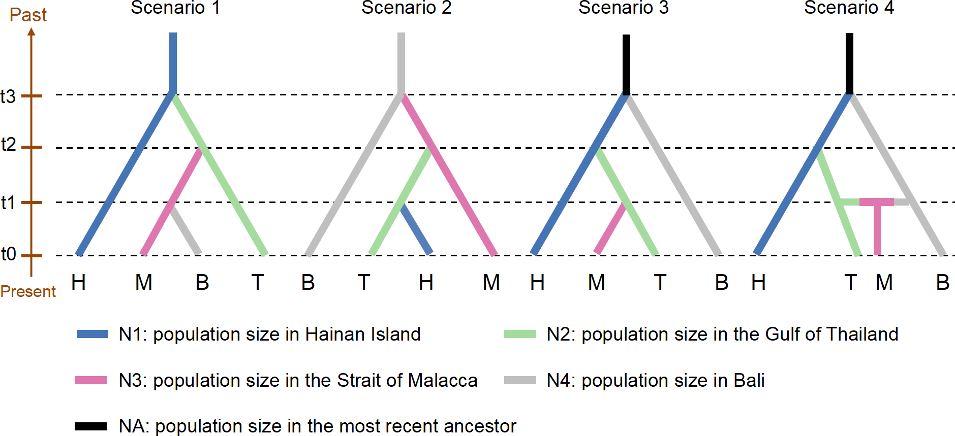 Evolutionary scenarios of S. polycystum were performed using the approximate Bayesian computation (ABC) approach in DIYABC v.2.1.0 (Cornuet et al., 2014). To keep the scenarios simple and reduce the computational time, 282 individuals were randomly selected from 16 populations for the DIYABC analyses. Four scenarios were defined based on the major groups identified by the geographic distribution (Figure 4): (a) Group H consisted of eight populations (CH, DF, LD, LH, DD, HT, WC, and BA) from Hainan Island, (b) group T contained three populations (KS, KC, and SS) from the Gulf of Thailand, (c) group M included three populations (MCR, MPR, and SP) from the Strait of Malacca, and (d) group B included one population (BL) from Bali. Four scenario hypotheses were tested: (1) S. polycystum survived in the Hainan Island refugium during the Pleistocene glacial epoch and expanded southward postglacially; (2) S. polycystum survived in the Bali refugium and expanded northward postglacially; (3) groups H and B survived in the glacial refugia, and group H split into group T, which diverged into group M; (4) similar to scenario 3, but group M had shared haplotypes/ribotypes with groups T and B; i.e., group M was an admixture of groups T and B.