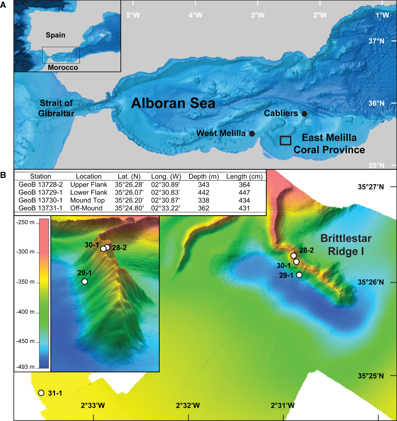 (A) Locality map of the Alboran Sea and East Melilla Coral Province as well as other known cold-water coral (CWC) mound provinces, West Melilla and Cabliers. (B) Bathymetry map of the CWC mound Brittlestar Ridge I in the East Melilla Coral Province with locations of the on-mound CWC reef sediment cores (GeoB13728-2, GeoB13729-1, and GeoB13730-1, labeled as 28-2, 29-1, and 30-1, respectively) and the off-mound sediment core (GeoB13731-1, labeled as 31-1; located in the far lower left corner) used for palaeoceanographic reconstructions (Fink et al., 2013; Portilho-Ramos et al., 2022). Inset in (B) provide core metadata and the location of the on-mound cores in profile.