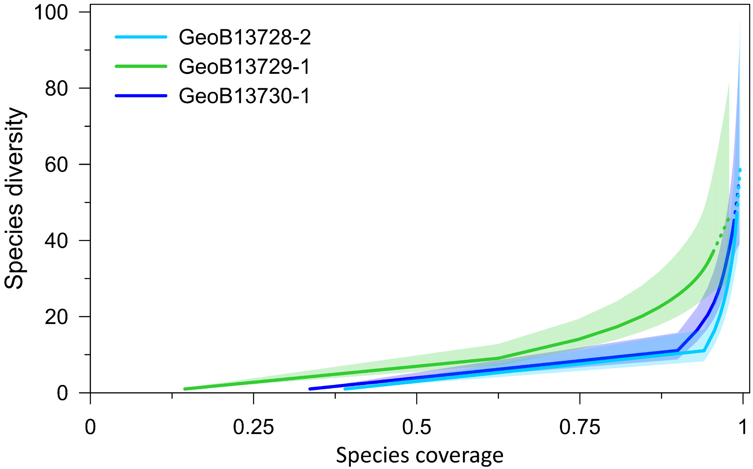 Coverage-based species rarefaction curves for each core. Solid lines represent observed data. Dashed lines represent extrapolated trends. Shading corresponds to 95% confidence intervals (Hsieh et al., 2016).
