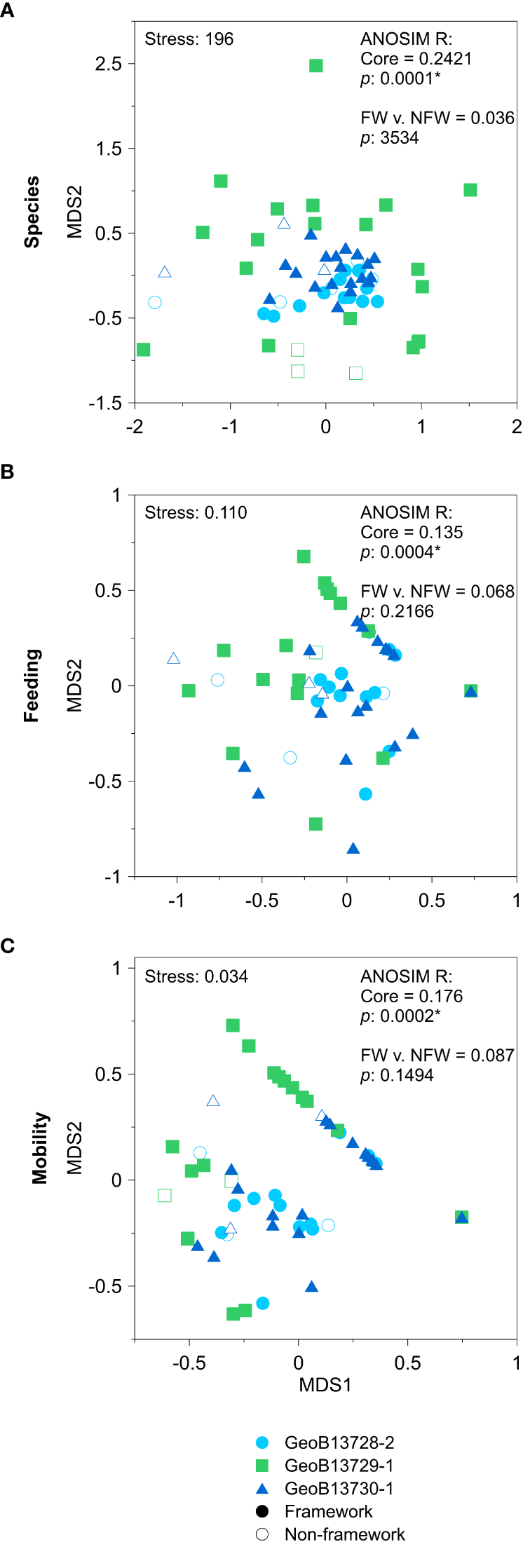 Non-parametric multi-dimensional (nMDS) scaling plots of all molluscan assemblages from all cores for (A) species, (B) feeding, and (C) mobility groups. ANOSIM R and p-values for analyses testing for differences between cores (Cores) and between assemblages associated with intervals of coral framework versus non-framework (FW vs. NFW) are provided within each relevant plot.