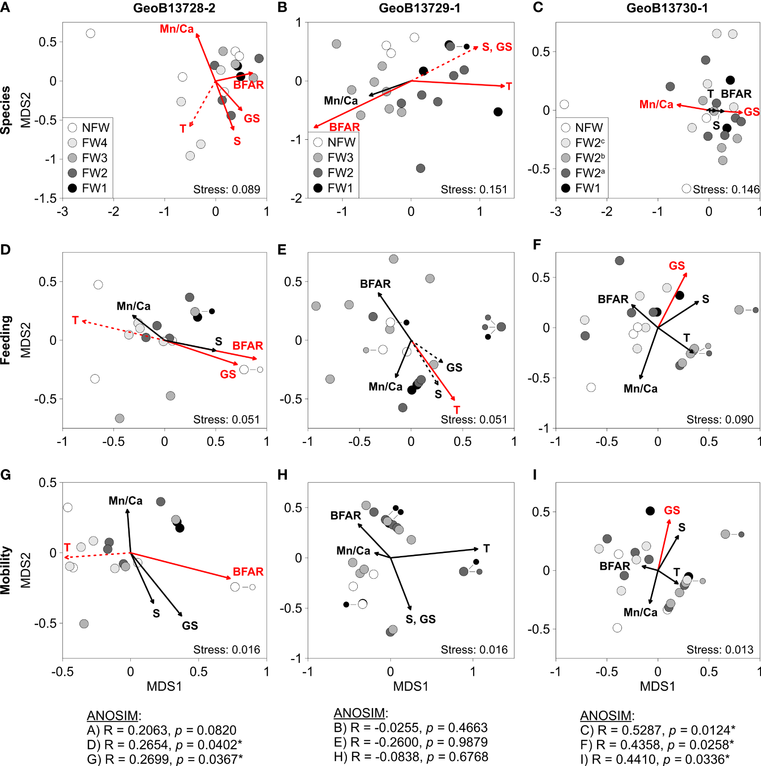 Non-parametric multi-dimensional scaling (nMDS) plots of molluscan species (A, D, G), feeding groups (B, E, H), and mobility groups (C, F, I) with rotational vector fitting of palaeoceanographic parameters for cores GeoB13728-2, GeoB13729-1, and GeoB13730-1. Color coding of molluscan assemblages (circles) corresponds with intervals of coral framework (FW) and non-framework (NFW) identified in Supplementary Figure 1. For core GeoB13730-1, FW2 is subdivided into three (nearly) equal groups due to the large number of assemblages within FW2. Vectors point towards molluscan assemblages with which palaeoceanographic data are correlated. Red vectors indicate significant correlations between palaeoceanographic data and molluscan data. Vectors with dashed lines indicate results from additional runs of the EnvFit analysis, for which palaeoceanographic parameters in the first runs were excluded due to significant correlations among parameters. See Tables S6, S7 for parameter correlations and vector p-values, respectively. Palaeoceanographic parameters (measured from the off-mound core GeoB13731-1): BFAR – benthic foraminifera accumulation rate, a proxy for surface ocean productivity and organic matter exported to the seafloor (i.e. food availability) (Portilho-Ramos et al., 2022); GS – mean grain size, a proxy for hydrodynamics (current strength) (Fink et al., 2013); Mn/Ca – ratio of Mn/Ca in benthic foraminifera, a proxy for bottom-water oxygenation (Portilho-Ramos et al., 2022); T – Mg/Ca ratio in benthic foraminifera, a proxy for bottom-water temperature (Portilho-Ramos et al., 2022); δ18O seawater – in benthic foraminifera, a proxy for bottom-water salinity (Portilho-Ramos et al., 2022). ANOSIM R and p-values corresponding with each plot (A-I) and testing for differences between assemblages associated with intervals of coral framework (FW) versus non-framework (NFW) are provided below the plots. * indicates a significant correlation.