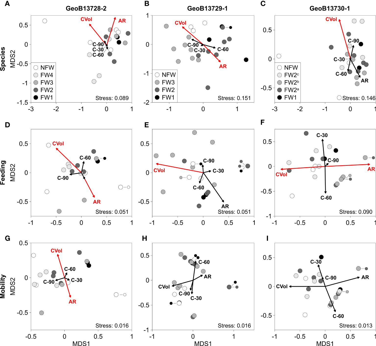 When all assemblages from the three cores are analyzed collectively, there is some overlap in the composition of the molluscan assemblages (for species, feeding, and mobility groups), from both intervals of CWC FW and NFW, among the three cores (Figure 5). Despite this overlap, ANOSIM analyses determine that these assemblages are significantly different among the three cores for species, feeding, and mobility groups but not between intervals of FW and NFW (Figure 5). In contrast, when molluscan assemblages are analyzed individually within each core (Figure 6), assemblages are significantly different between intervals of CWC FW and NFW in cores GeoB13728-2 and GeoB13730-1 for feeding and mobility groups as well as for species in core GeoB13730-1. In core GeoB13729-1, there are no significant differences between FW and NFW assemblages.