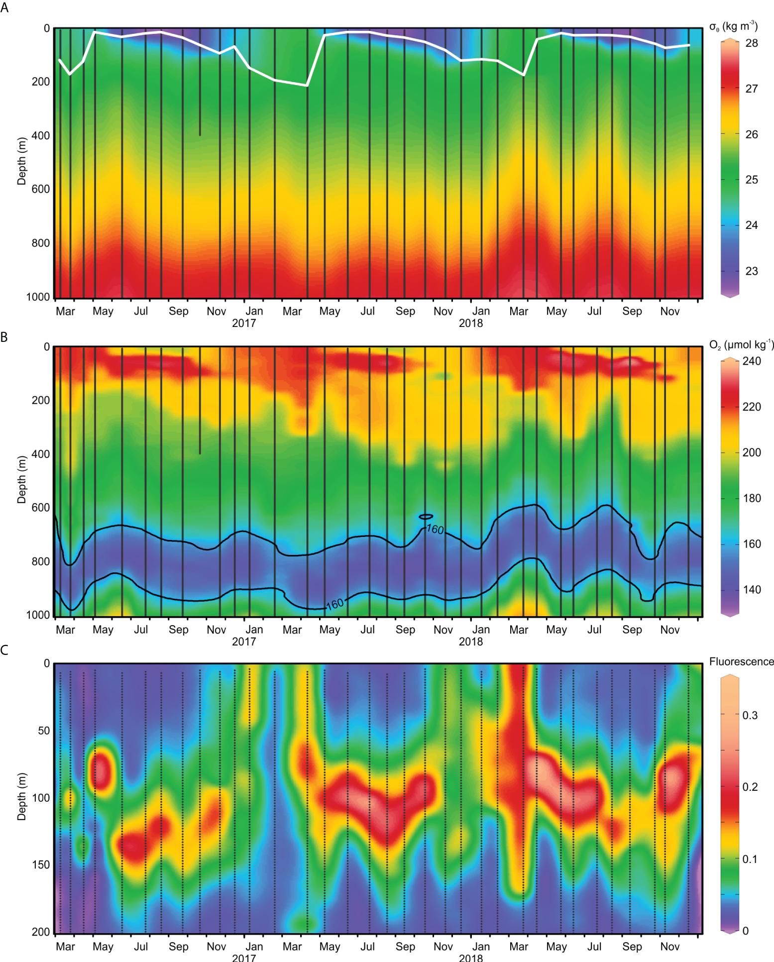 (A) Density (σθ; kg m-3), (B) oxygen (µmol kg-1) and (C) fluorescence (RFU) profiles at BATS station from March 2016 to December 2018. Thin, vertical lines indicate sampling events. Density and oxygen profiles are 0-1000 m, meanwhile fluorescence is shown only in the epipelagic (0-200 m). Mixed Layer Depth (MLD) is indicated by a white line in the density profile. The oxygen minimum zone is defined as the region with less than 160 µmol kg-1, delineated with a black line in the oxygen profile.