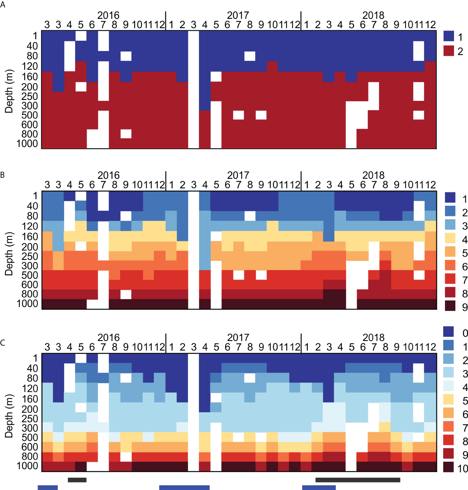 Assignment for each sampled depth, at each month, to the community-composition based on non-hierarchical clusters for (A)K=2 (upper panel) and (B)K=9 (middle panel). Numbers are indicative of months at the top of each panel. K=2 separates the epipelagic and the mesopelagic, meanwhile K=9 reflects the epipelagic seasonality and depth-stratification. The lower panel (C) shows the assignment of each sample to the 11 hydrographic layers defined by Curry et al. (see text, and Table 1). Blue bars correspond to deep mixing events, black bars to uplift of the deeper layers due to the passage of eddies.