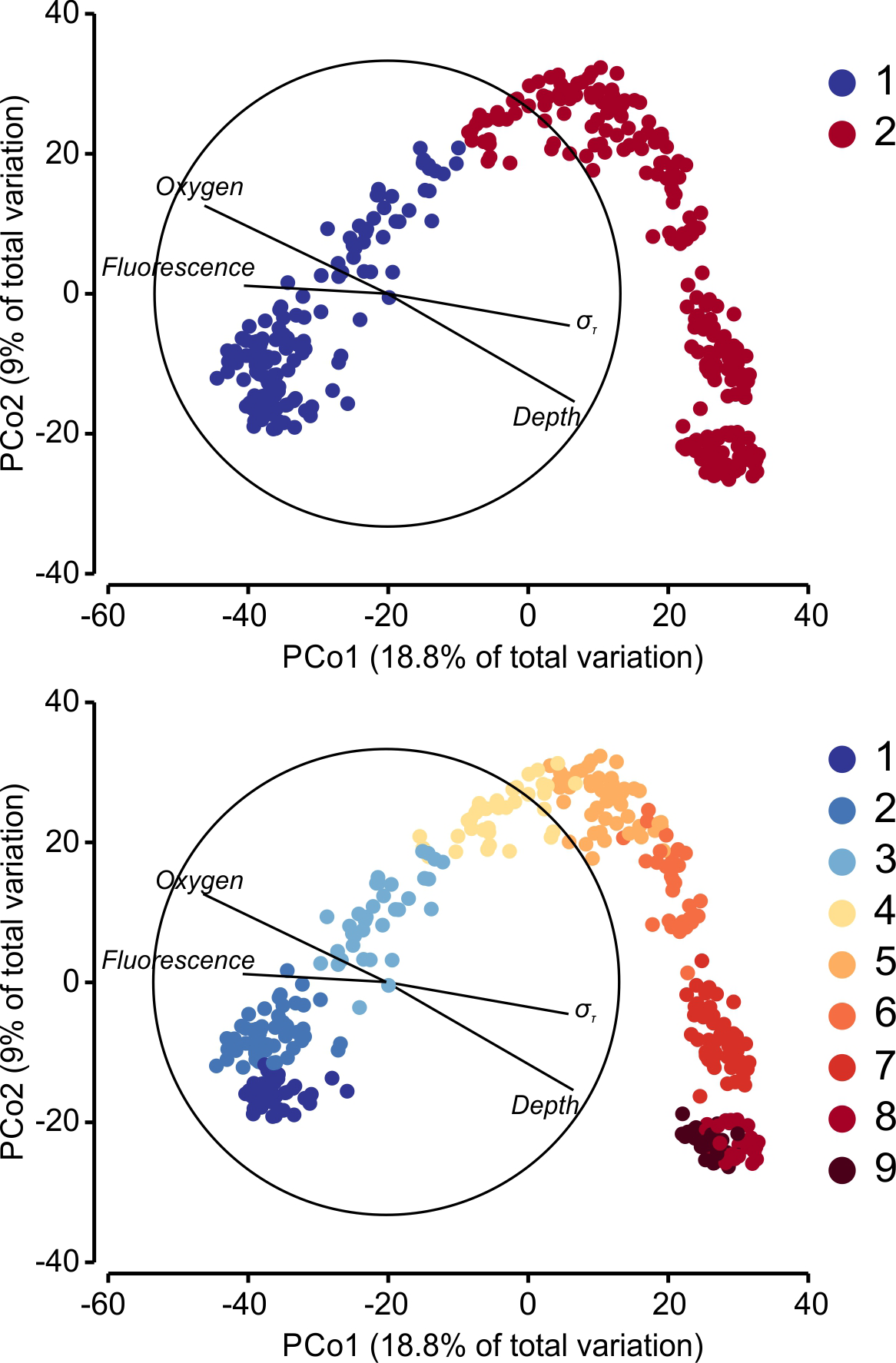 The PCoA ordination arranged the samples with the first axis roughly corresponding to a combination of depth and environmental factors (Figure 3), with many samples departing from their theoretical position if based only on depth (also shown in Figure 2B). The BioEnv procedure determined that the best model to relate the sample ordination with the environmental variables combined O2, fluorescence, depth and density (ρ=0.729 p < 0.001), but since depth and density are highly correlated, the next best model included O2, fluorescence and density (ρ=0.690, p < 0.001). The proposed hydrographic layering was the best-correlated single environmental variable (ρ=0.651, p < 0.001). Superimposing the non-hierarchical clustering onto the PCoA, the K=2 showed a sharp divide between the clusters, despite the intrusions of the upper cluster into deeper layers described before (Figure 1). For K=9, separation of clusters 1 & 2 reflected the seasonal shifts in the upper epipelagic layers (mixed vs stratified conditions). The remaining clusters projected consecutively in the PCoA, with very little mixing at the boundaries. The PCoA also indicated a larger separation between cluster 7 (occupying depths 500 – 600 m) and the other communities. In contrast, clusters 8 (OMZ) and 9 were very close to each other, with minimal mixing.