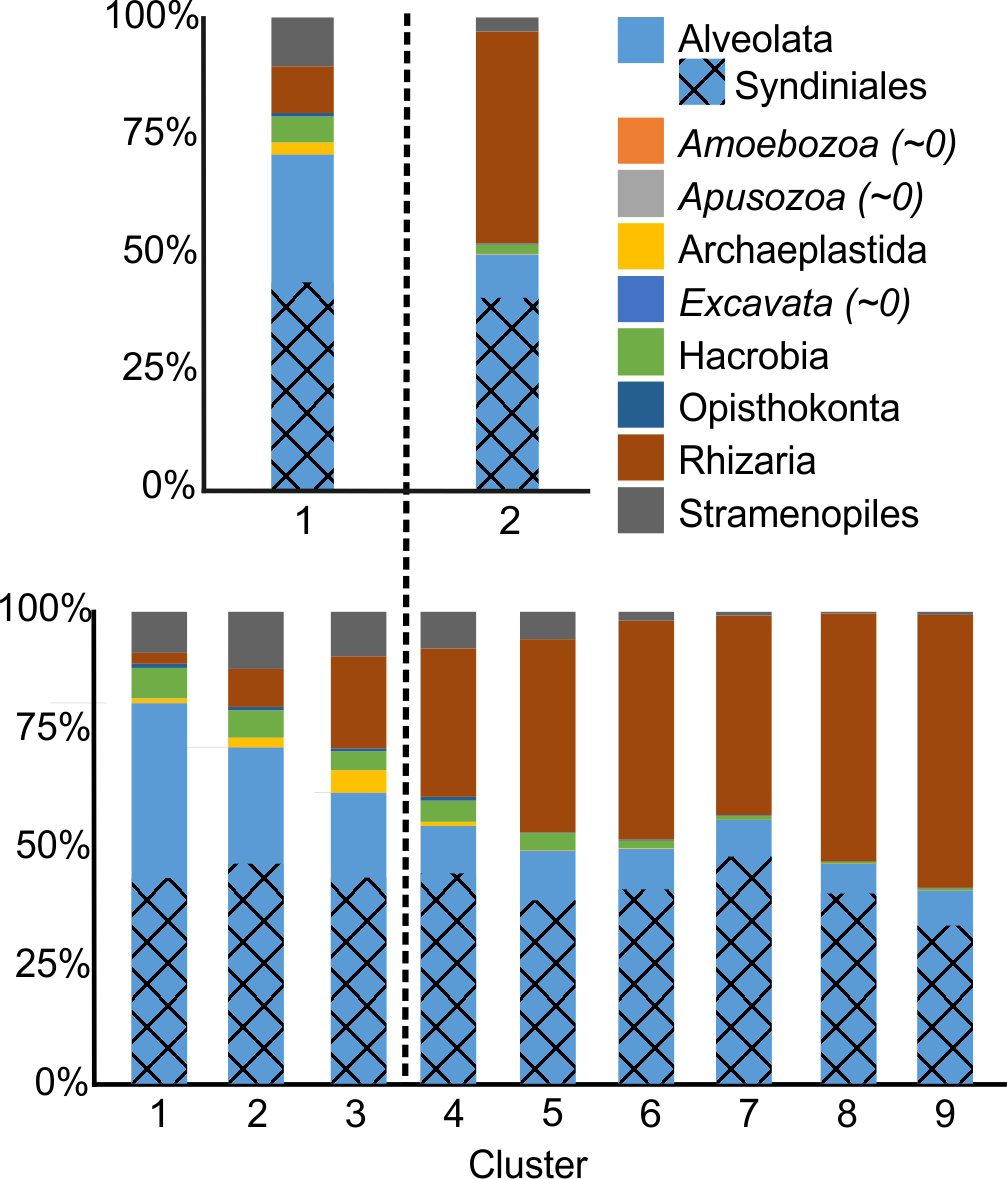 Taxonomic composition (at clade level) for each non-hierarchical cluster at K=2 (top) and K=9 (bottom). The parasitic order Syndiniales is highlighted within the Alveolata, showing its dominance within this phylum. Dashed line approximate the divide between the epi (left) and the mesopelagic (right).
