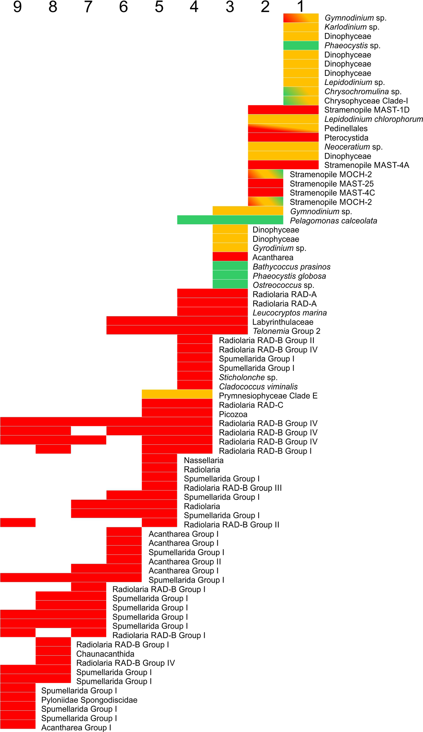 Functional profile (red: heterotroph, orange: mixotroph, green: autotroph) for each of the main components of the nine clusters, as indicated by the SIMPER analyses (after removal of parasitic lineages). When the V4 region was shared among lineages with different functional profiles, the corresponding colors are indicated in the bar.