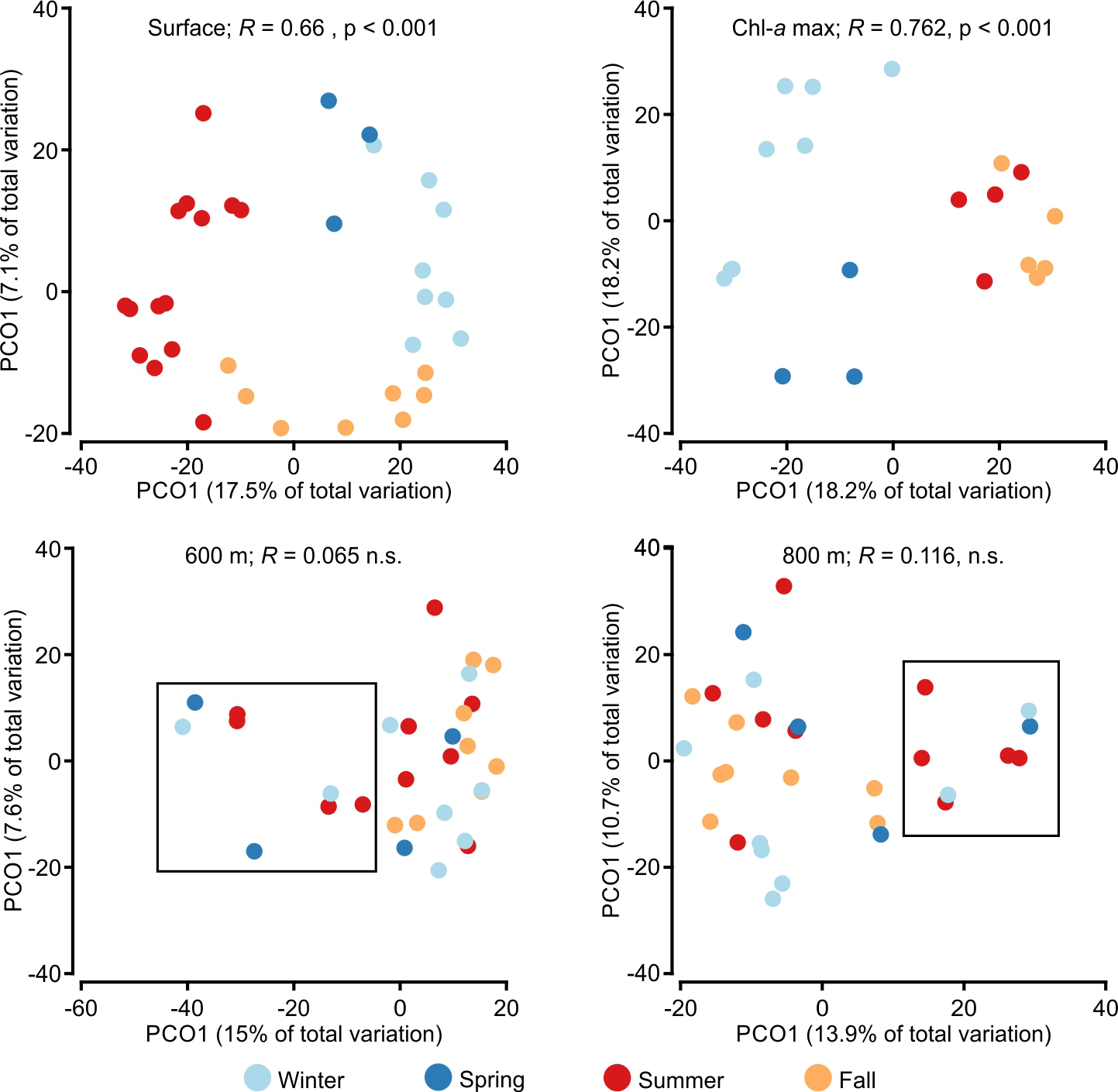 PCoA ordinations for samples from surface (upper left), Chl-a maximum (upper right), 600 m depth (lower left) and 800 m depth (lower right), based in Bray-Curtis distances, with ANOSIM R values for factor “seasons” indicated for each graph, and colors indicating seasons. In the epipelagic, a seasonal signal was detected, especially in the upper layers. In the mesopelagic (lower panels) no seasonality was observed, and samples diverging from the center core at these depths corresponded however to the uplifting events due to the passage of hydrographic features (within the squares).