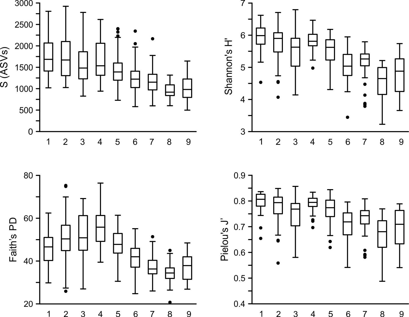 Box and whiskers graphs for the distribution of the number of taxa (S), Shannon’s H’, Faith PD and Pielou’s J’ for all samples from each cluster at K=9. Boxes indicate median, first and third quartiles. Meanwhile S and H’ follow a decreasing pattern with depth, PD shows a maxima at cluster 4 (below the DCM), and Pielou’s J’ shows three different decreasing trends, in the epipelagic, and the upper and lower mesopelagic.
