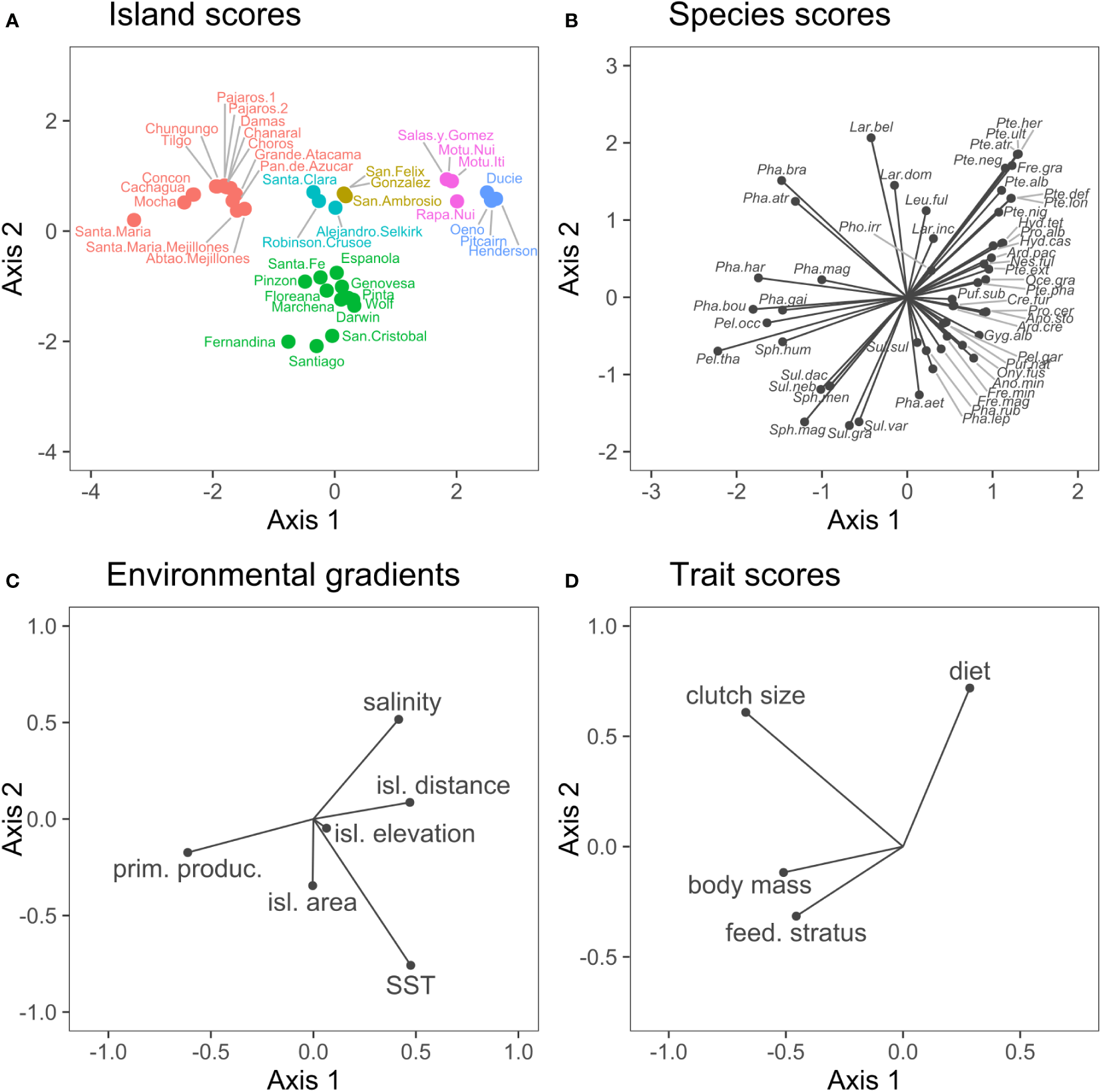 RLQ analysis showing the scores obtained after correspondence and principal component analysis (see Data analysis for details) for (A) islands, (B) species, (C) environmental variables, and (D) traits. Species abbreviations are defined in Data sheet 1.