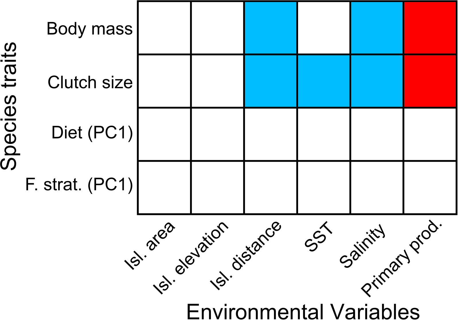 Results of the fourth-corner statistics analysis depicting the significant (p < 0.05) correlation between seabird traits (rows) and environmental variables (columns). Cell colors indicates if the correlations were positive (red) or negative (blue). Isl. = islands; SST = Sea surface temperature; prod. = productivity; F. strat. = Feeding stratum; PC1 = a vector after principal component analysis (see 2.2. for details and Supplementary Material Table S2).