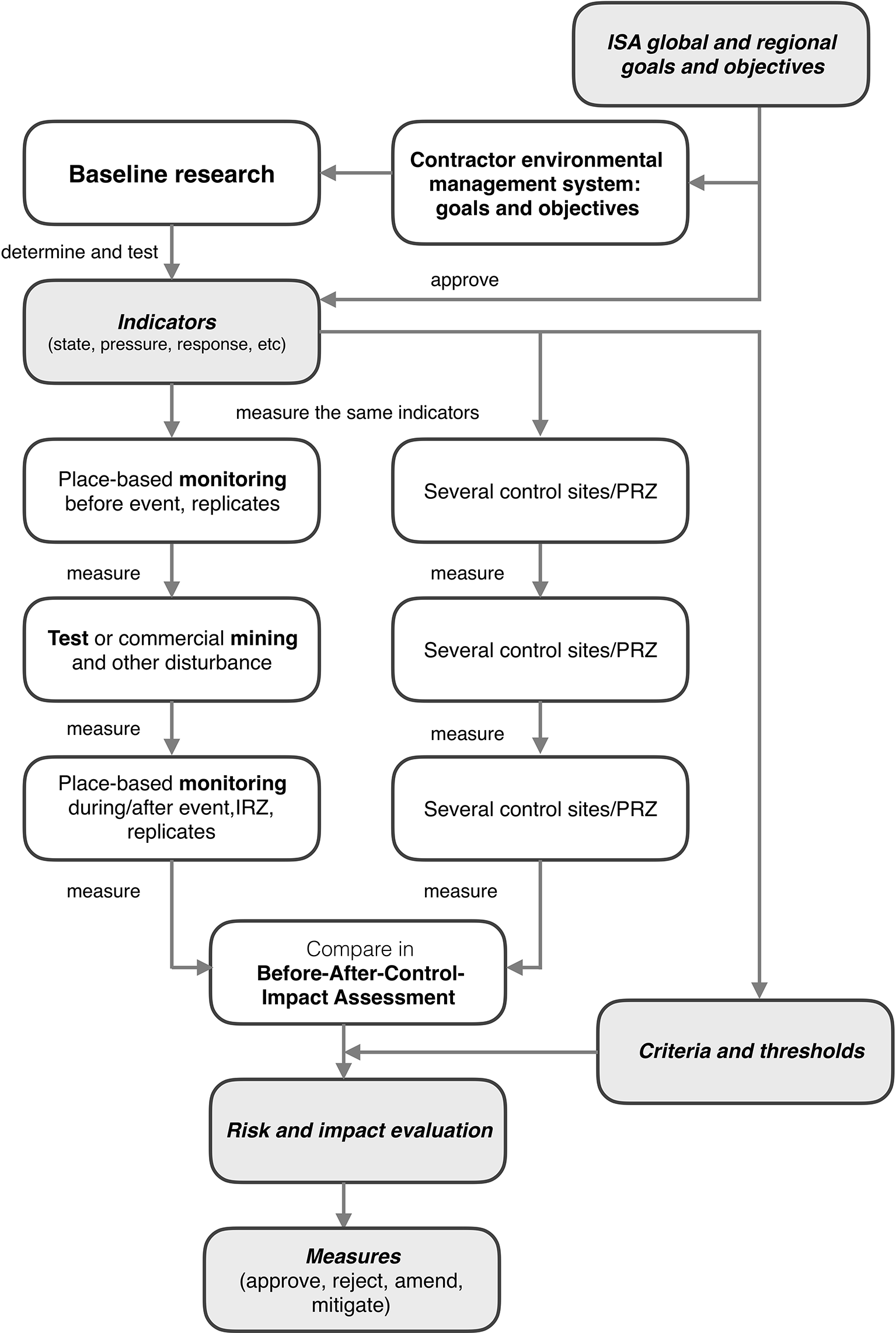 Baselines need to identify suitable indicators to be monitored, which could be set at a regional level through regional environmental management plans (REMPs). Suitable indicators need to be informed by the knowledge about the respective environment and by environmental goals and objectives for a particular region. As the latter do not exist in sufficient regional detail for ISA contractors, it is currently not foreseeable that all contractors will work towards the same indicators and proceed with similar monitoring methods and strategies. Furthermore, the indicators identified from the baseline studies, as well as eventual thresholds for deviations from normal, can only be verified with information from small-to-medium-scale test mining yet to take place.