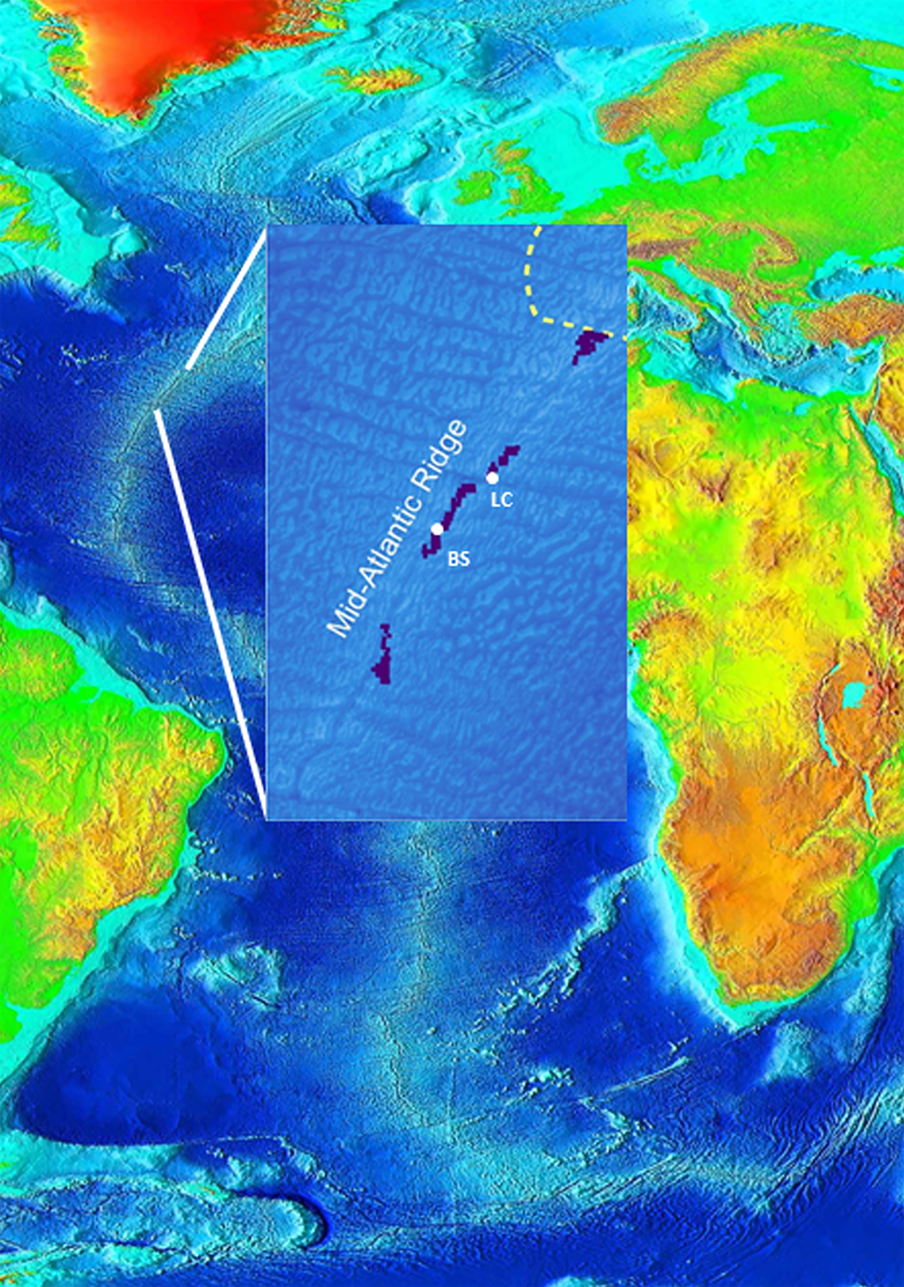 Location of the Polish contract area (PECA) on the Mid-Atlantic Ridge; LC, Lost City; BS, Broken Spur; dark squares mark exploration blocks; dotted yellow line marks the boundary of Portugal’s Extended Continental Shelf (based on imagery available from NOAA, http:///www.ngdc.noaa.gov/mgg/image/2minrelief.html and ISA, https://isa.org.jm/files/files/documents/Public%20information%20on%20contracts%20Poland.pdf).