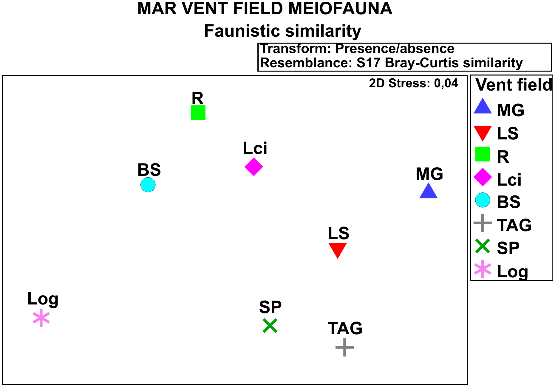 This paper is based on literature data mining, whereby data on benthic communities in the PECA have been sought in, and extracted from, book chapters and peer-reviewed papers stemming from information collected during research cruises to the MAR (Thaler and Amon, 2019). As can be seen from Table 1, information on the PECA benthos is limited, fragmentary and patchy. Basically, data on the PECA benthos have been collected almost exclusively at the two active hydrothermal vent fields, the Broken Spur and the Lost City. In this context it is worth mentioning that fairly extensive data on benthic communities in the PECA, those in the Broken Spur vent field in particular, have been contributed by Russian authors investigating the MAR ecosystem, based on materials collected during cruises up to 2003 (Gebruk and Mironov, 2006) (Table 1). Boschen-Rose and Colaço (2021) looked for similarities/dissimilarities in the composition of benthic communities across the hydrothermal vent fields in studies reported up to 2020. We performed a similar analysis for the meiobenthos, not covered by Boschen-Rose and Colaço (2021) data, using the non-metric multidimensional scaling (MDS) routine of the PRIMER v. 7 software package (Clarke and Gorley, 2015). To narrow the uncertainty margin of the analysis, which might have been introduced by using taxa of various ranks, the input data matrix included taxa identified to at least the genus level only.
