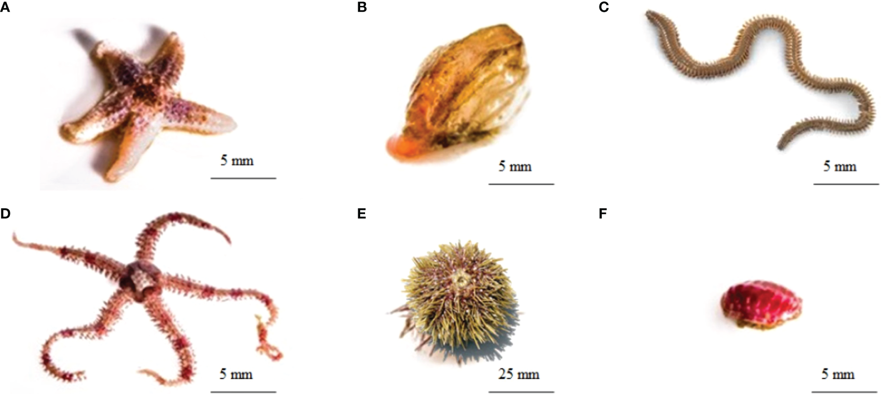 The six animal species included in the present study’s food web analyses; (A) common sea star, Asterias rubens; (B) wrinkled rock-borer, Hiatella arctica [bivalve]; (C)Nereis spp. [polychaete]; (D) daisy brittle star, Ophiopholis aculeata; (E) green sea urchin, Strongylocentrotus droebachiensis and (F) Atlantic red chiton, Tonicella rubra (Images: (A, B, D, F) - Sean Hacker Teper; (C)https://www.enasco.com/p/Sandworm-Clam-Worm-Nereis%2C-Preserved%2BLS01292; (E)https://pugetsoundsealife.sseacenter.org/pugetsoundsealife.com/puget_sound_sea_life/Green_Sea_Urchin.html.