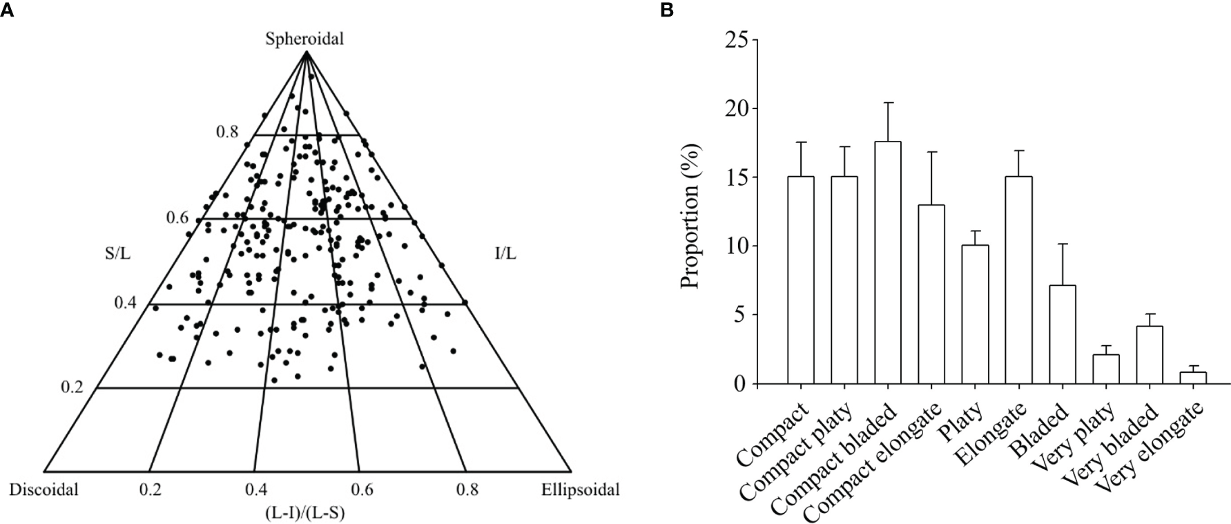 (A) Ternary diagram of rhodolith [Lithothamnion glaciale] shape relative to purely spheroidal, discoidal, and ellipsoidal rhodoliths [N=247; one solid circle per rhodolith]. Rhodoliths were collected in April 2017 at the South site (see Figure 1A). The position of each rhodolith in the diagram is determined by its sphericity, calculated from the length of its longest [L], intermediate [I], and shortest [S] axes. (B) Corresponding proportion of rhodoliths under each of 10 finer shape categories as defined by Sneed and Folk (1958).
