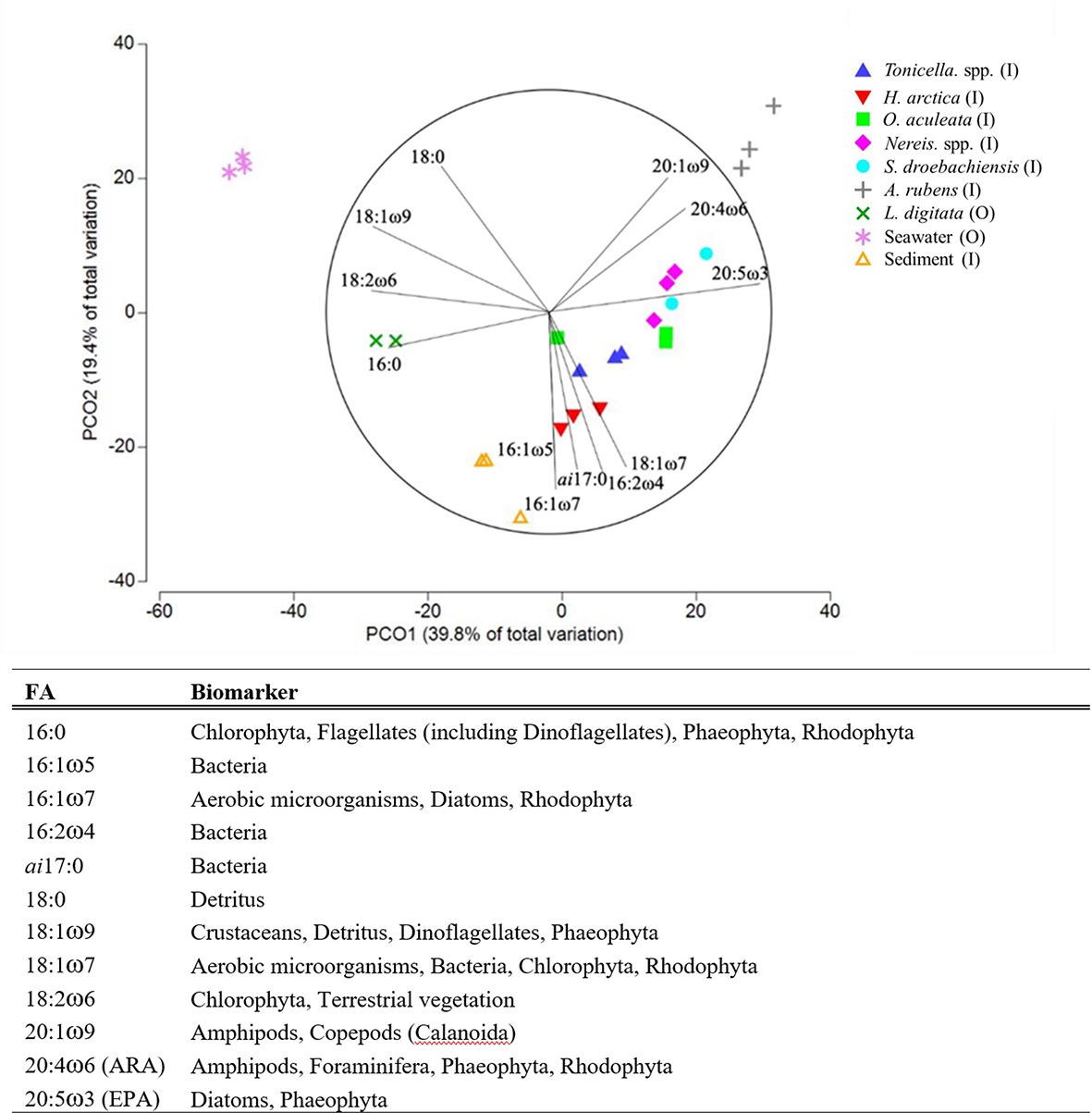 To examine differences in the proportions of FAs among samples (N=25), we used the same statistical approach (two one-way PERMANOVAs; one with Component as factor followed by one with Functional Group as factor) with the same data exclusion and grouping as for the lipid classes analysis. We then used a one-way SIMPER analysis (run on untransformed data with a Bray-Curtis similarity matrix) with the factor Component (nine of the 10 components of the food web studied [six animal species, kelp, sediment, and seawater], to identify potential food sources and the main FAs contributing to the lipid composition of each component (Kelly and Scheibling, 2012; Gabara, 2014). To limit extraneous data variability while focusing on the most significant FAs, we included only FAs contributing to over 70% of the similarities in the SIMPER analysis. We used a follow-up principal coordinates analysis (PCO; also run on untransformed data with a Bray-Curtis similarity matrix) with the factor Component (same as above), mainly for visualization of the feeding relationships among specific groups of organisms (Guest et al., 2008; Drazen et al., 2009). To increase clarity on the PCO, we plotted only samples with a Pearson coefficient of correlation >65% (plus DHA; 22:6ω3, because of its importance as an essential FA).
