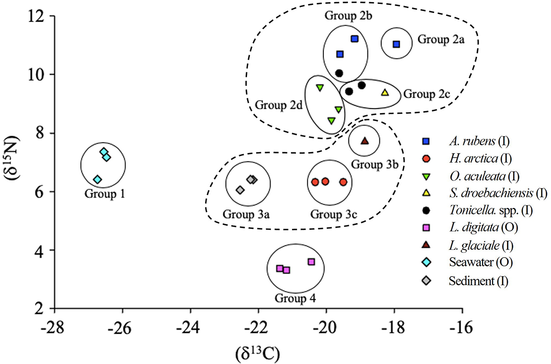 We examined differences in carbon (δ13C) and nitrogen (δ15N) isotope ratios with two one-way PERMANOVAs (one for each type of ratio; both types based on Euclidean distance matrices with 9999 permutations) with Component as factor. The δ13C isotope ratio analysis (N=27, accounting for accidental loss of three samples during the analyses) included all taxa (six animal species, kelp, and rhodoliths) and both environmental components (seawater and sediment). We included both environmental components and all except one taxon (Nereis spp., for which we lacked sufficient amounts of tissues for quantification of stable isotope ratios) in the δ15N isotope ratio analysis (N=26, accounting for accidental loss of one sample during the analyses). Due to our using separate samples for lipid-extract and stable isotope analyses, we used the averages of stable isotope results of individual components to make comparisons to lipid and FA data. To group and map, in the form of a dendrogram, statistically different components of the food web, we also carried out a cluster analysis using “Group Average” clustering on δ13C and δ15N isotope ratios simultaneously, and complementary SIMPROF test (Euclidian distance matrix with 9999 permutations) (N=23 because of a few unmatched pairs of δ13C and δ15N ratios) (Grall et al., 2006; Gabara, 2014). Four main isotopic groups emerged from the SIMPROF test. We therefore ran follow-up one-way PERMANOVAs (one with both isotopic ratios combined, followed by one for each type of isotopic ratio) and complementary one-way ANOVAs and post-hoc tests with the factor Group to identify differences among these four main trophic groups.