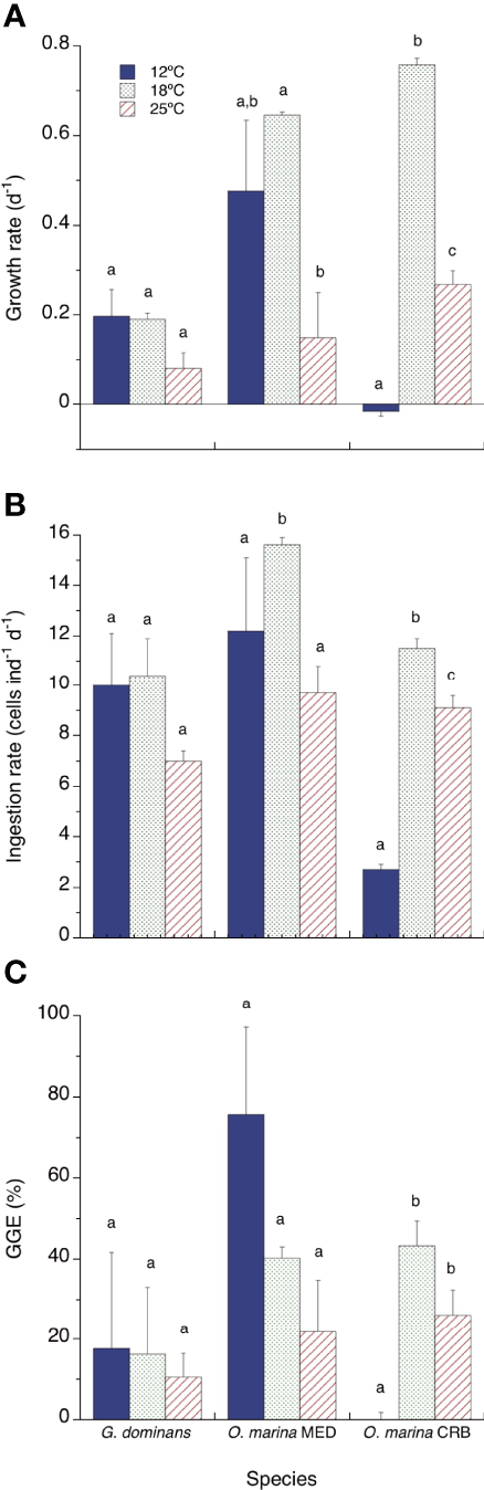 Growth rates (A, d-1), ingestion rates (B, cells ind-1 d-1) and growth gross efficiencies (C, GGE %) of the three protozoans investigated at 12, 18 and 25°C. Statistical differences (p<0.05) within each species are indicated by different letters. The error bars are SE. For GGE, the SE have been calculated using the square root formula for error propagation.