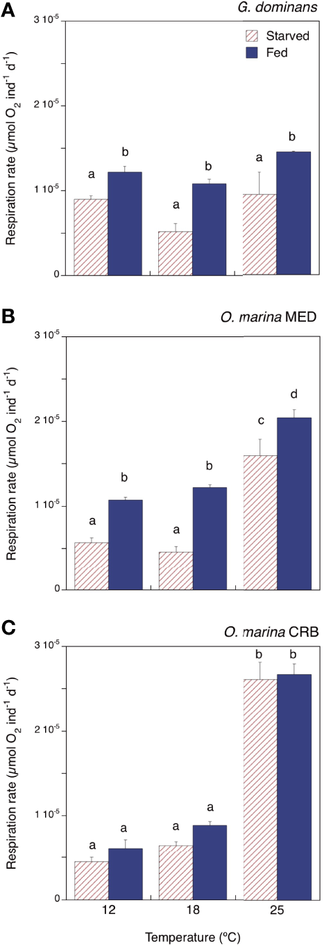 Respiration rates (µmol O2 ind-1 d-1) of starved and fed (A)G dominans, (B)O. marina MED, and (C)O. marina CRB at the different temperatures investigated. Statistical differences (p<0.05) within each species are indicated by different letters. The error bars are SE.