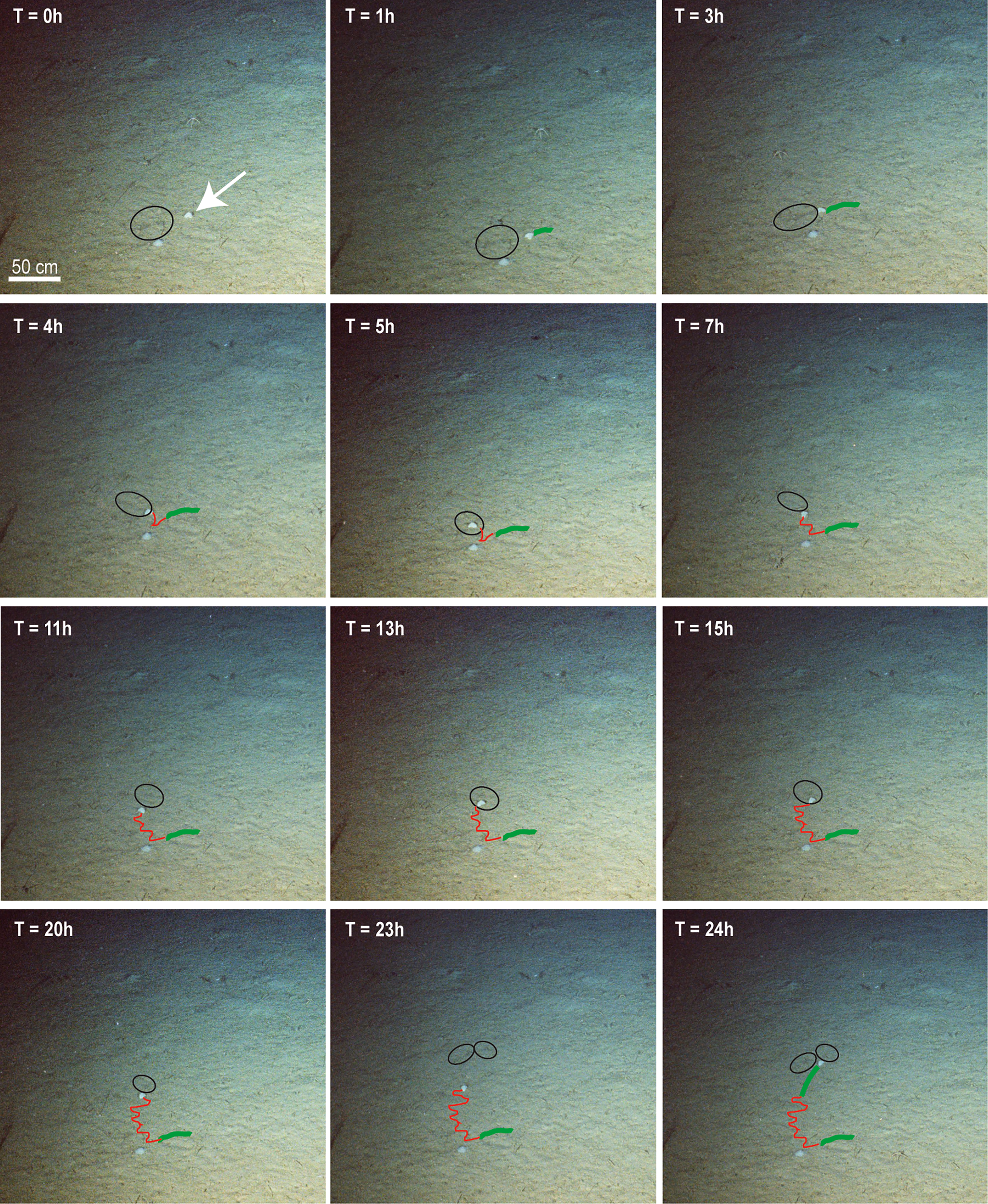 A sequence of images (hourly) that record the movement pattern of E. rostrata (white arrow) and the distribution of organic matter patches consumed by the echinoid (black circles). Note the Run (thick green line; T = 23h to T = 24h) and Mill (thin red line; T = 11h to T = 15h) behaviors of E. rostrata (sensuKaufmann and Smith, 1997).